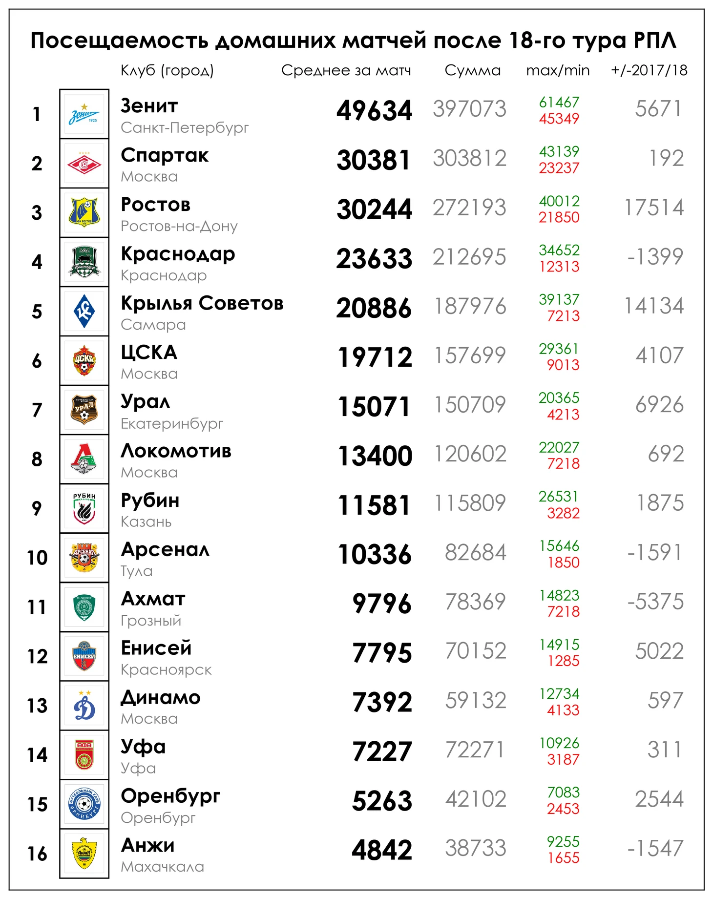 Несмотря на общий отток болельщиков с трибун, положительный баланс относительно прошлого сезона имеют 12 клубов из 16.
