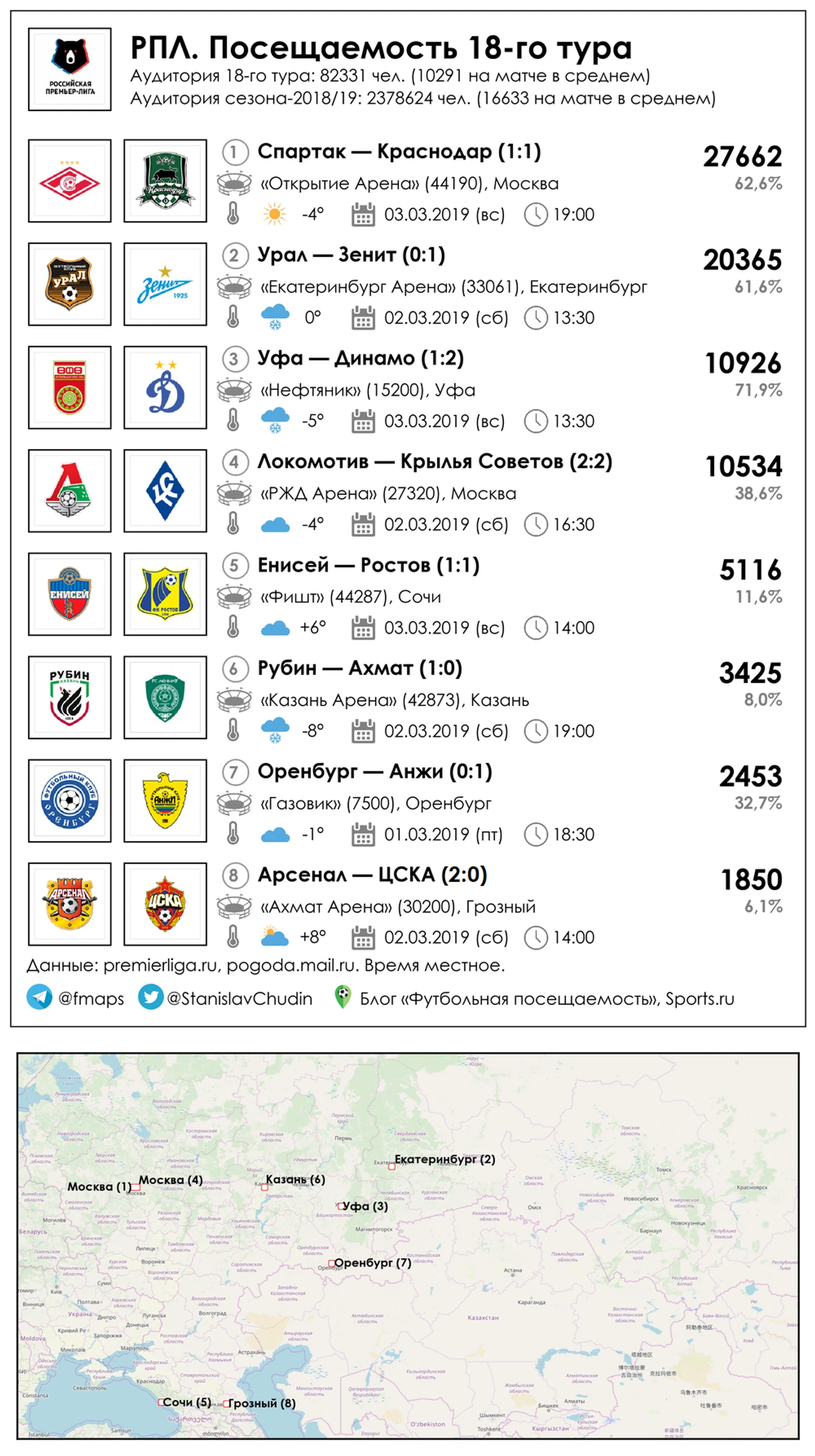 Матчи 18-го тура премьер-лиги собрали 82331 зрителя (10291 в среднем на одной игре) — это худший показатель в сезоне.