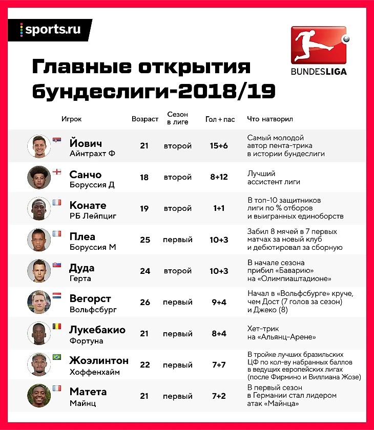 Автор однобоко составил таблицу "Открытия сезона", подогнав ответ под свою тему. Например, купленные за немалые деньги средневозрастные Вегхорст и Плеа, которые и должны приносить результат, у автора открытия сезона, а великолепно играющий после тяжёлой травмы защитник молодёжной сборной Германии Клостерманн и очень прибавивший и завоевавший место на левом бровке "Герты" ещё более юный Миттельштедт - не открытия. Не открытие и молодой защитник "Штутгарта" Баумгартль, мощно прогрессирующий в последние годы и входящий в пятёрку лучших по проценту выигранных единоборств. Почему-то не зачислен в открытия полузащитник Гладбаха Флориан Нойхаус, долгое время лидировавший по количеству голевых передач.
