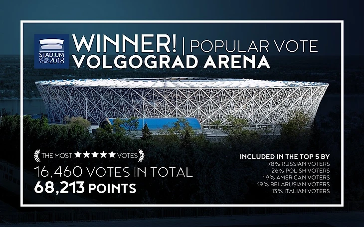 В голосовании, в котором мог принять участие любой желающий, первое место досталось российскому стадиону «Волгоград Арена», набравшему 68213 очков.