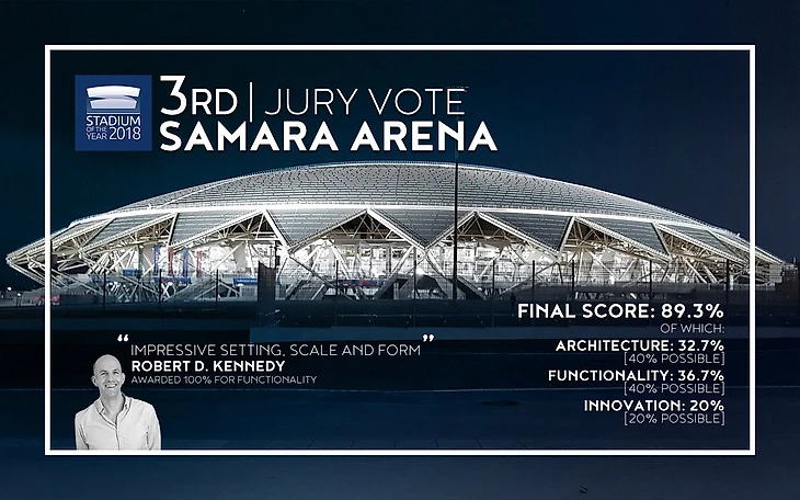 Второе место в голосовании болельщиков досталось «Самара Арене» (48249 очков), а тройку лучших замкнул стадион «Нижний Новгород» (39704 очка). Все эти комплексы принимали матчи ЧМ-2018.