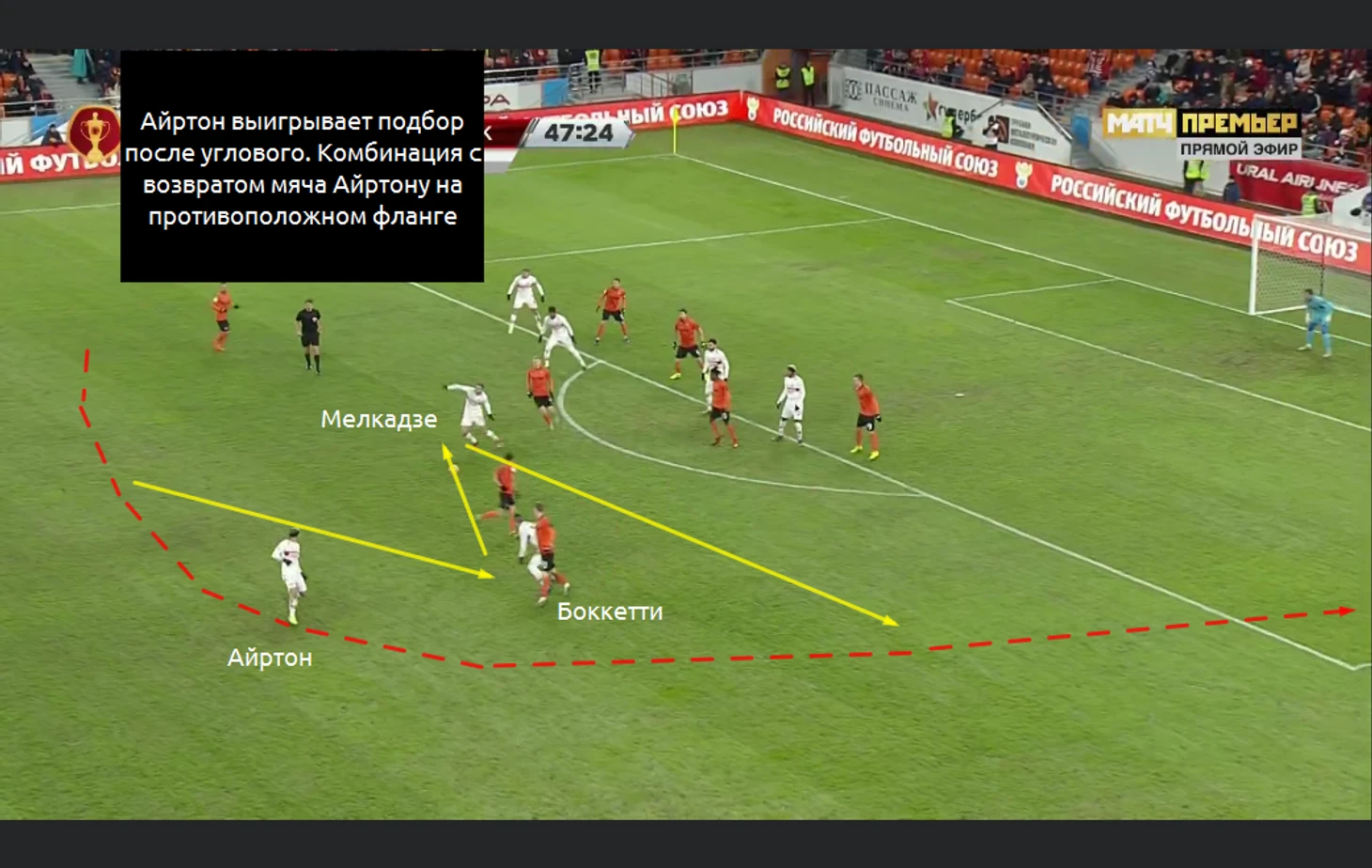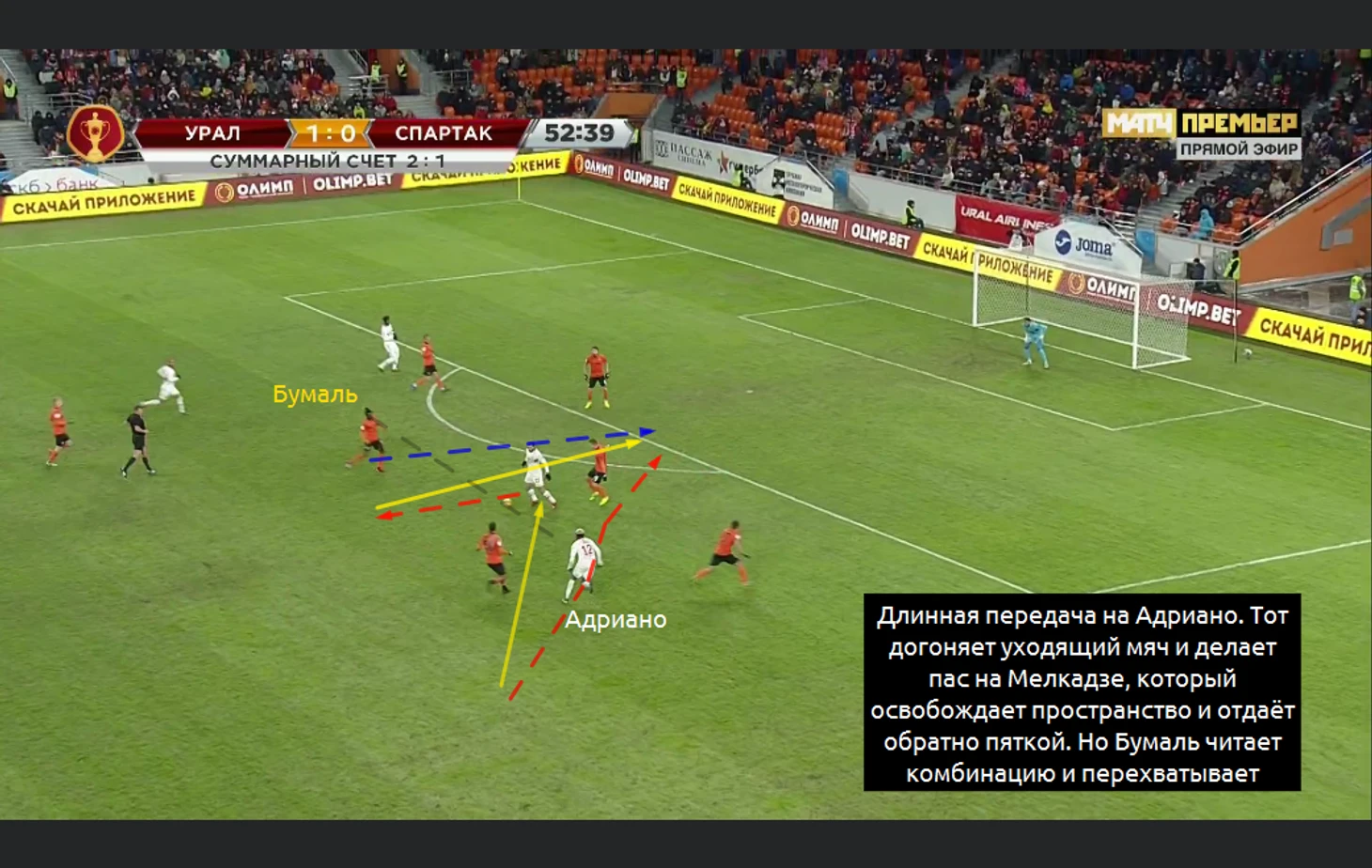 По иронии судьбы именно длинная передача и проигрыш "второго" мяча стали результатом пропущенного гола. Селихов выдал лонгболл на Адриано. Тот делает скидку вперёд, а там защитники Урала головой выбивают мяч вперёд. В результате верховой борьбы он летит к Погребняку и накрывать его бежит Гулиев. Борьба будет проиграна, а Погребняк сделает передачу на Бикфалви, который остался совершенно один:
