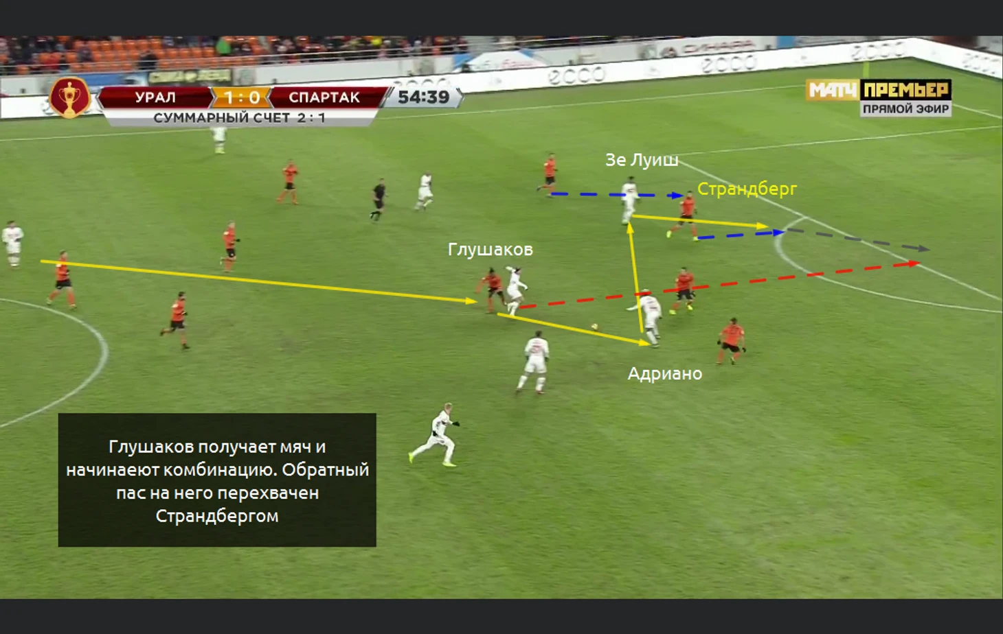 Одна из частых комбинаций с начальным пасом Глушакова и выводом его на ударную позицию. Здесь пас от Зе Луиша перехватит Страндберг: