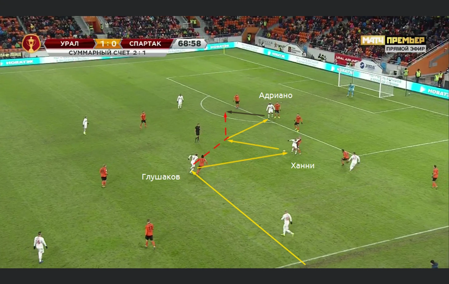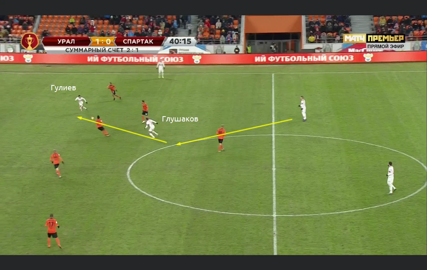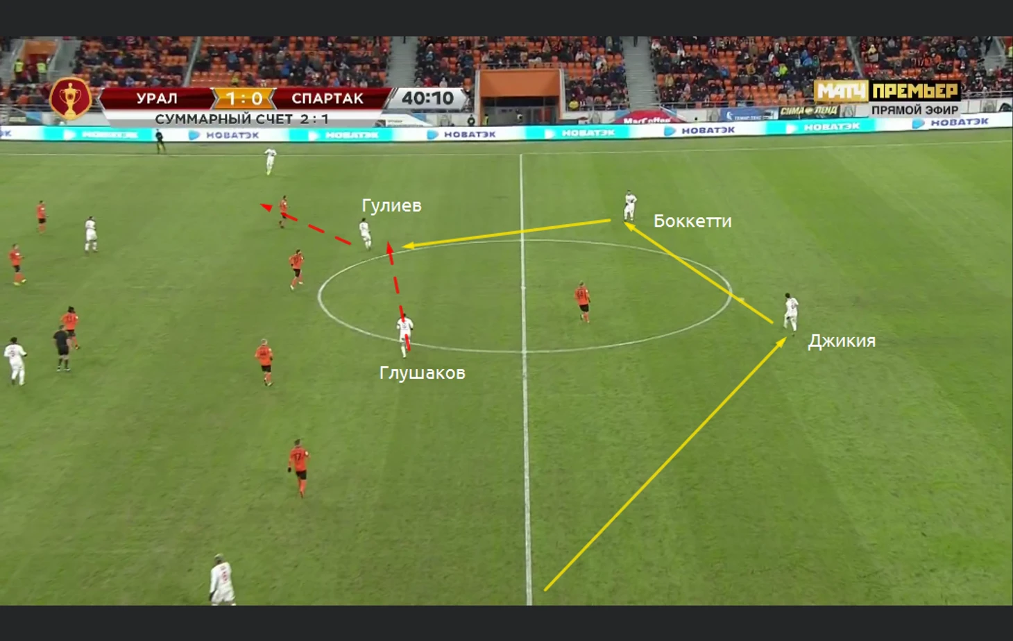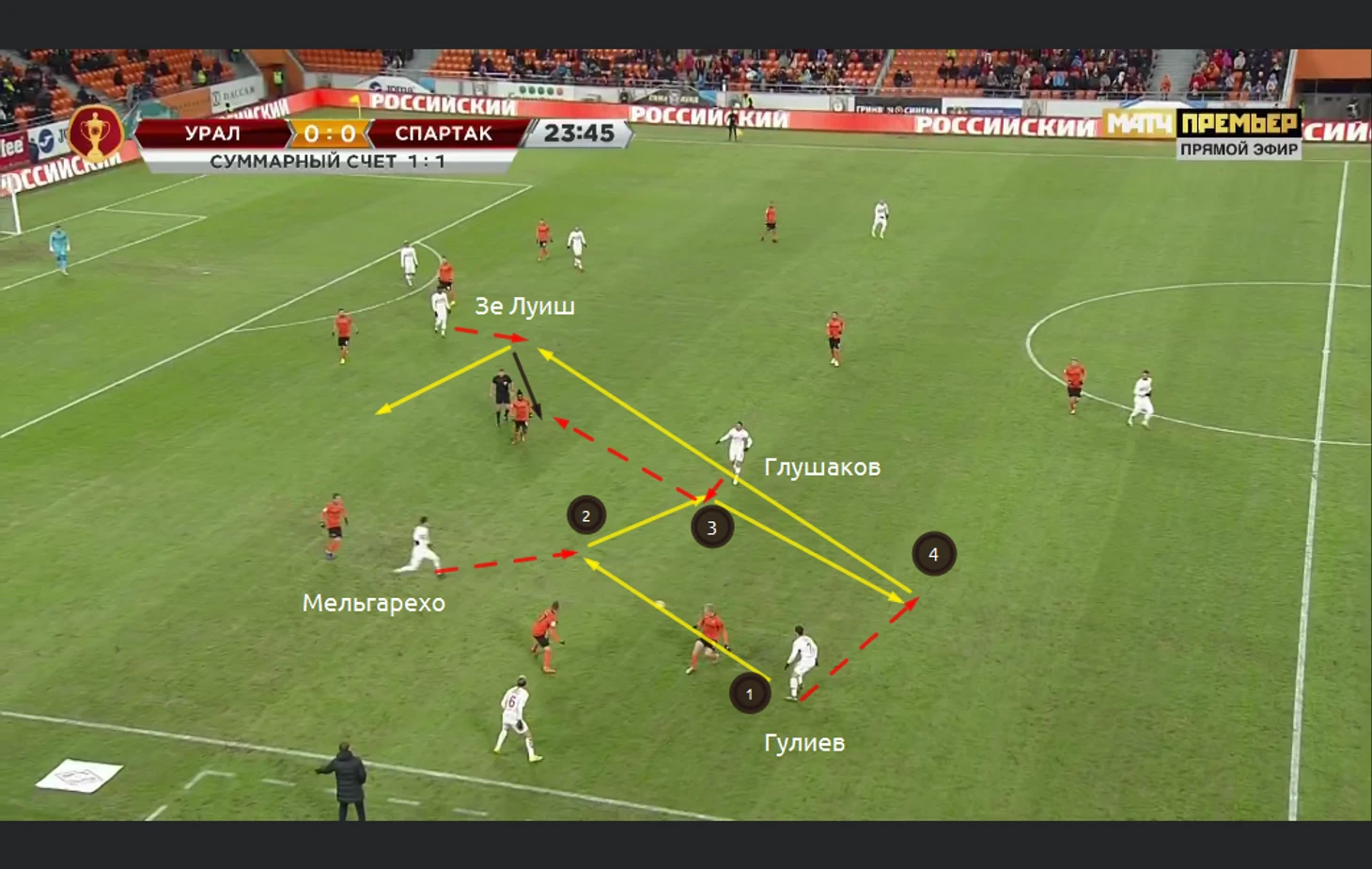 Многие пеняют Кононову за отсутствие "стеночек-забеганий-комбинационной игры". Факт, что для тонкой игры в атаке нужна сыгранность. Но откуда она будет, если на сборах так и не было наиграно стабильного состава? Поэтому претензии к наставнику красно-белых справедливы. Но с другой стороны, не правы и те, кто говорит, что Кононов не сделал ровным счётом ничего. Это не так. Вот примеры комбинаций в атакующей трети. Розыгрыш аута и Гулиев пасует на Мельгу. Тот на Глушака. Денис отдаёт Гулиеву и идёт передача на Зе, который не смог покатить на Глушакова. Впрочем, Зе Луиш весь матч не попадал в темп атак и совершал много брака в передачах: