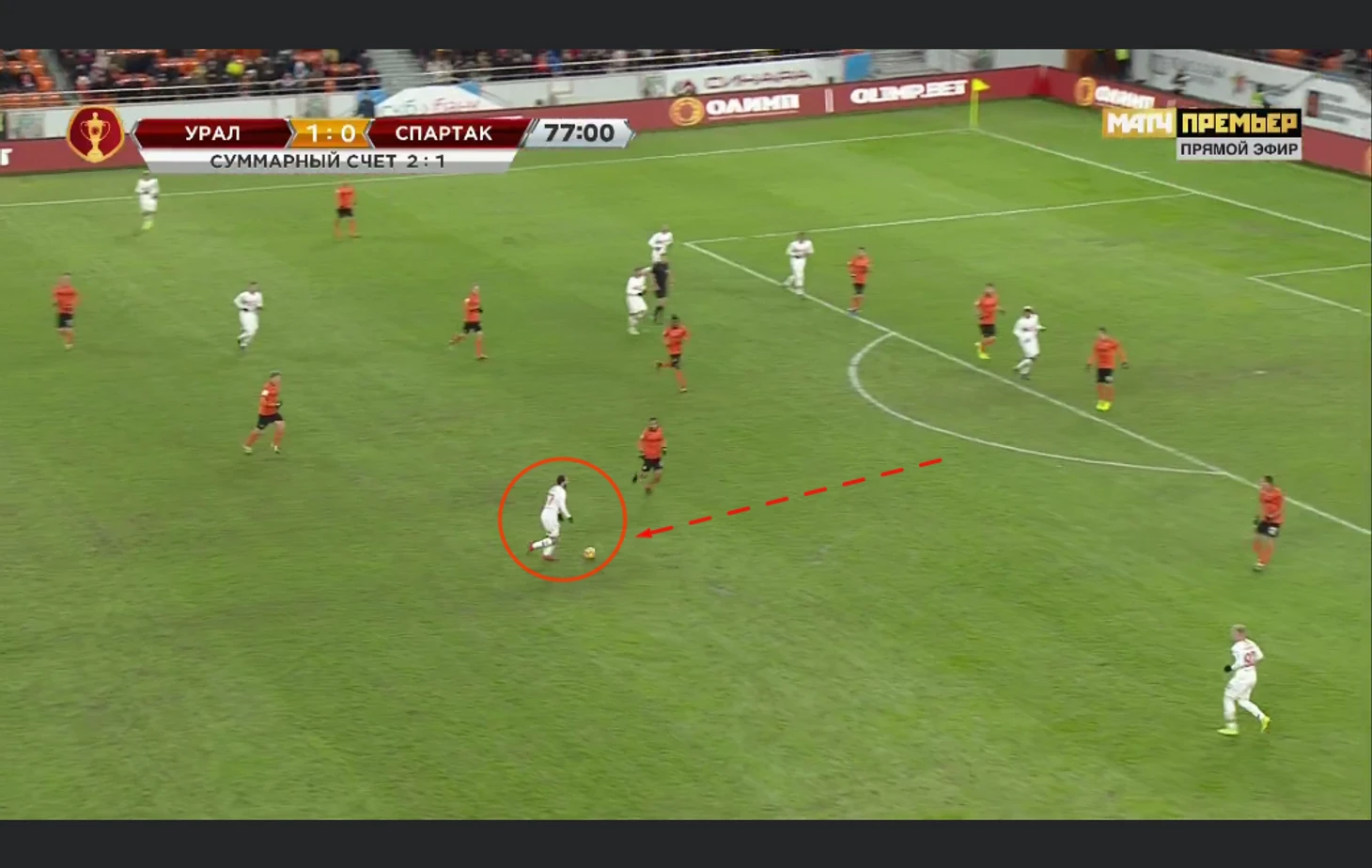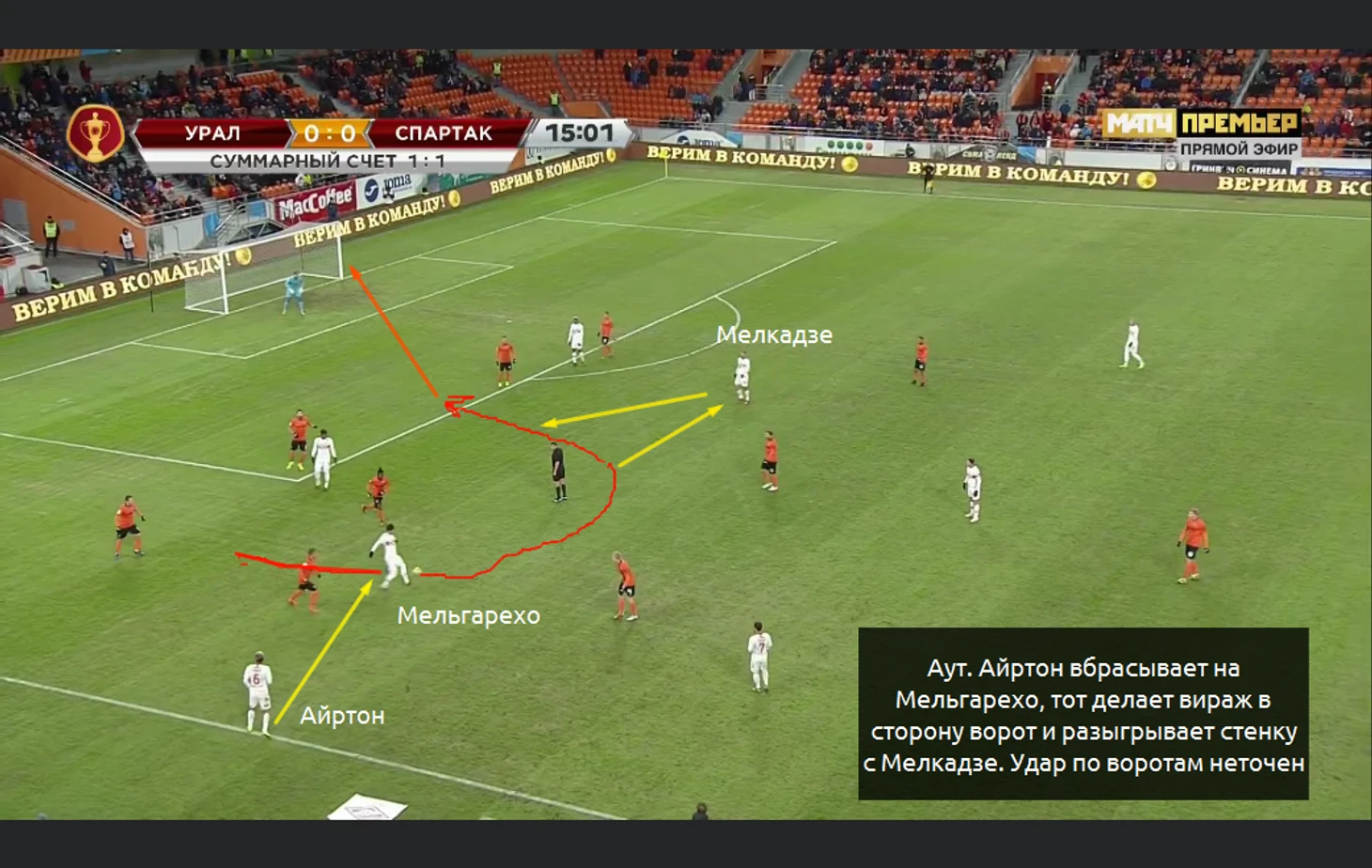 Атака закончилась пасом на Мелкадзе, но вингер Спартака до мяча не добрался:
