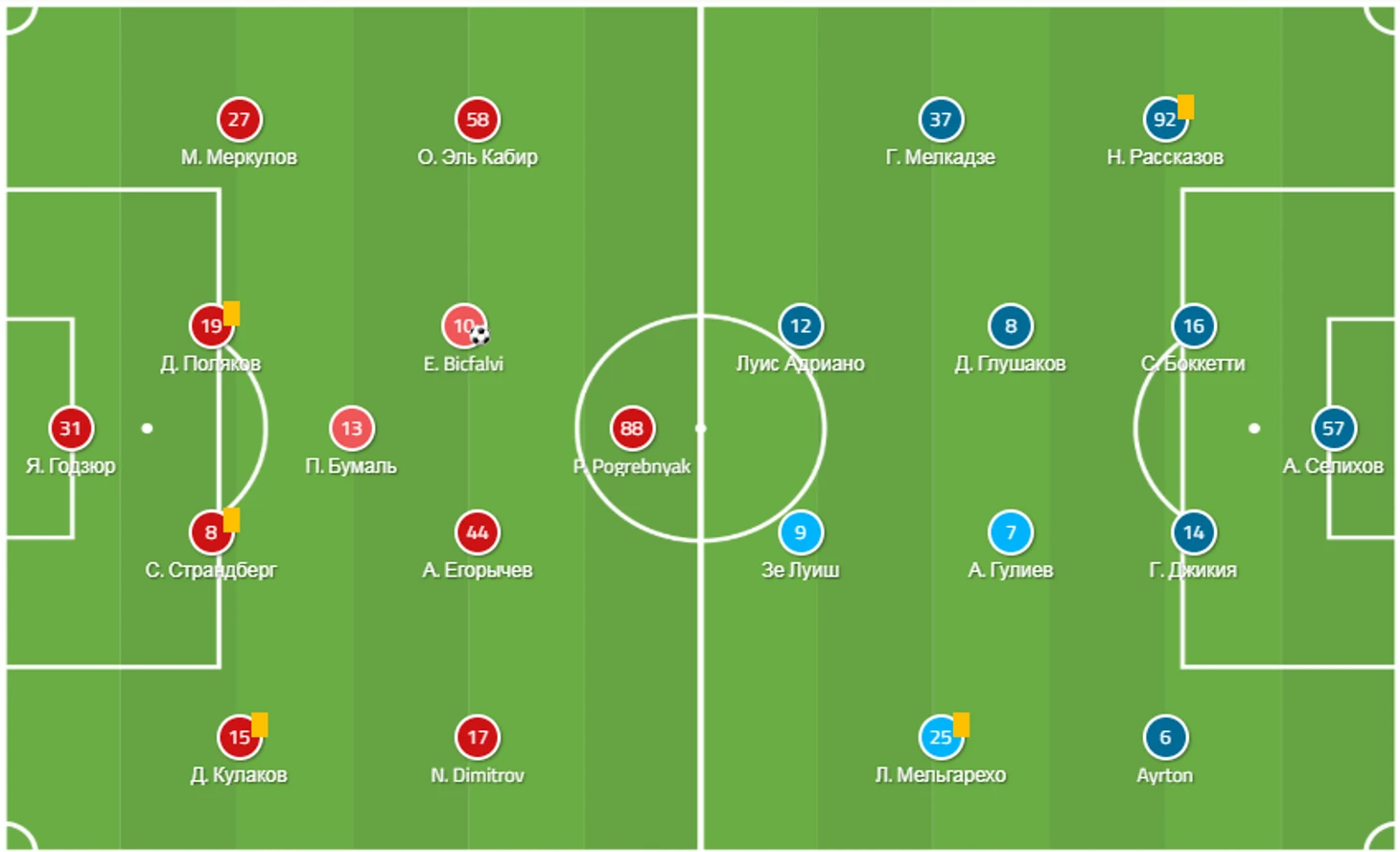 Во втором тайме Кононов решил отрядить одного игрока из линии нападения глубже, чтобы лучше связывать атаку с полузащитой и в большей степени наладить выход в атаку не через фланги и забросы, а через центр. В роли "десятки" на разных отрезках выступали Ханни и Адриано, а также Мелкадзе, который с фланга уходил глубже и в центр: