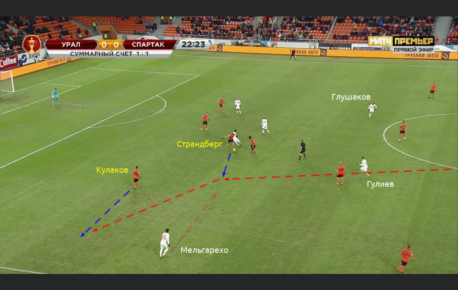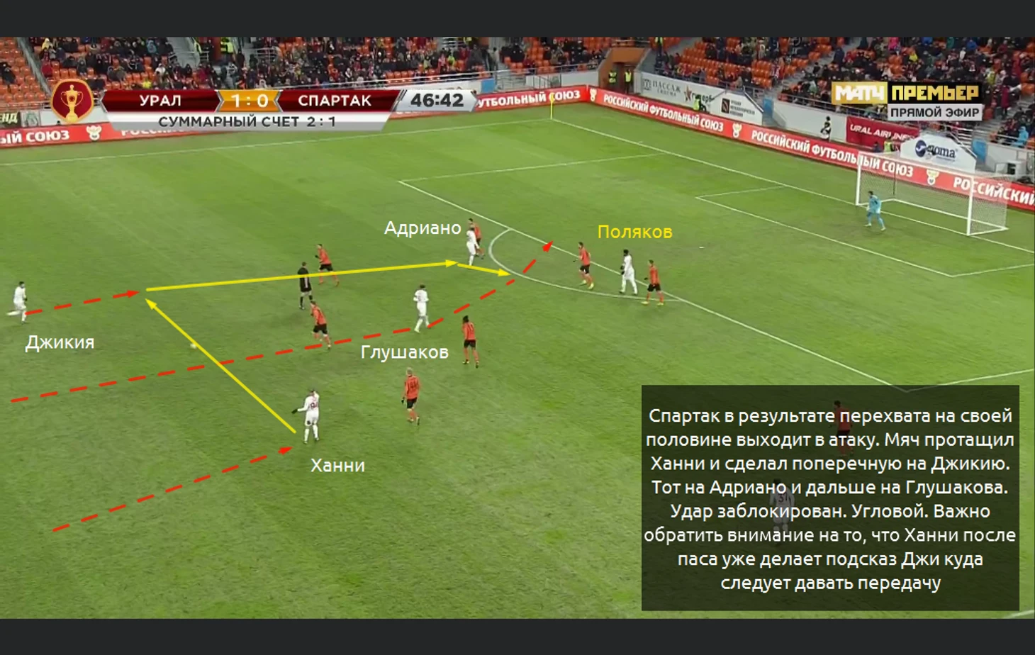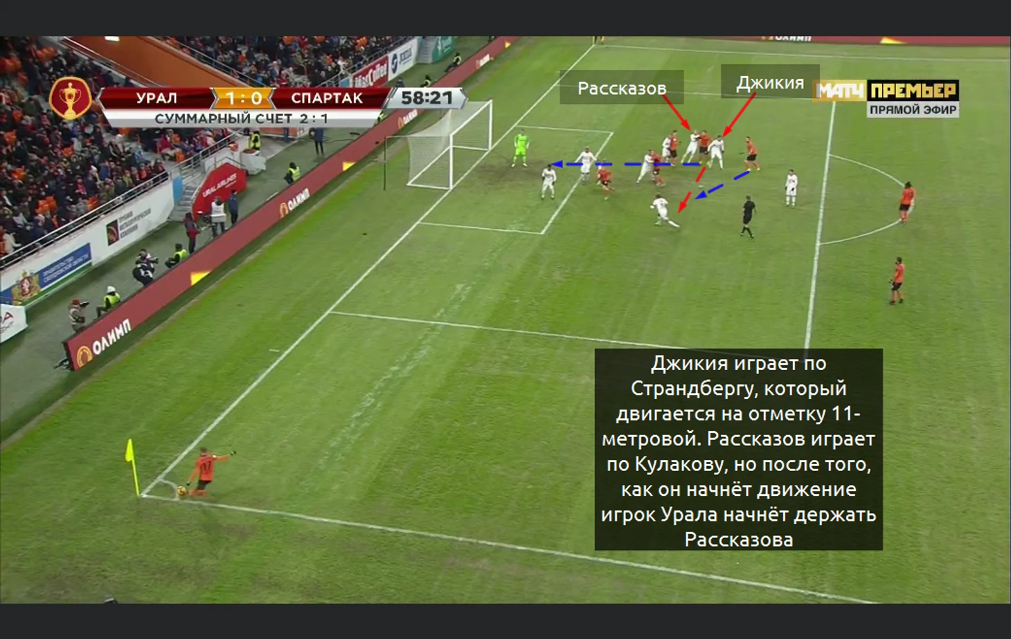 Тем не менее самый опасный стандарт показал Урал. Идея была довольно простой, но она сработала. Игрок Урала сделал блок Рассказову и не пустил его за Поляковым (на скрине написано, что бил Кулаков). Джикия же играл по Страндбергу. Таким образом игрок Урала без помех наносил удар после скидки, но Спартаку повезло. Да и Селихов правильно играл в воротах: