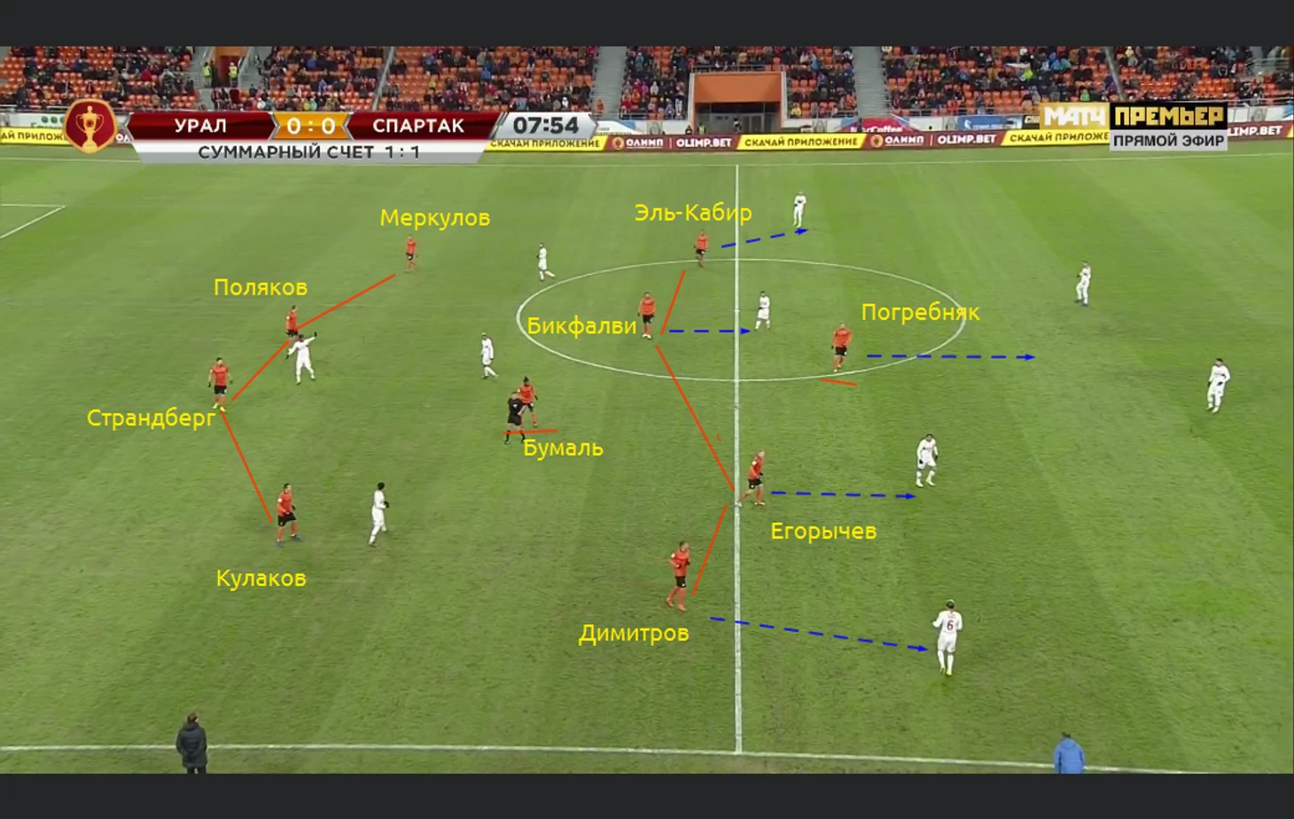 Дмитрий Парфёнов в этом матче сделал ставку на схему 4141. Это отличная оборонительная схема, в которой за счёт оборонительного опорника Урал получает, во-первых, численное преимущество в центре поля, а во-вторых, Бумаль стал дополнительным заслоном в центре и перекрывал нападающих Спартака, которые до перерыва не слишком активно отходили в глубину поля, а потому были вновь несколько отрезаны от команды. Да и если бы красно-белые вышли 4231, то по "десятке" было бы легко выставить опекуна.