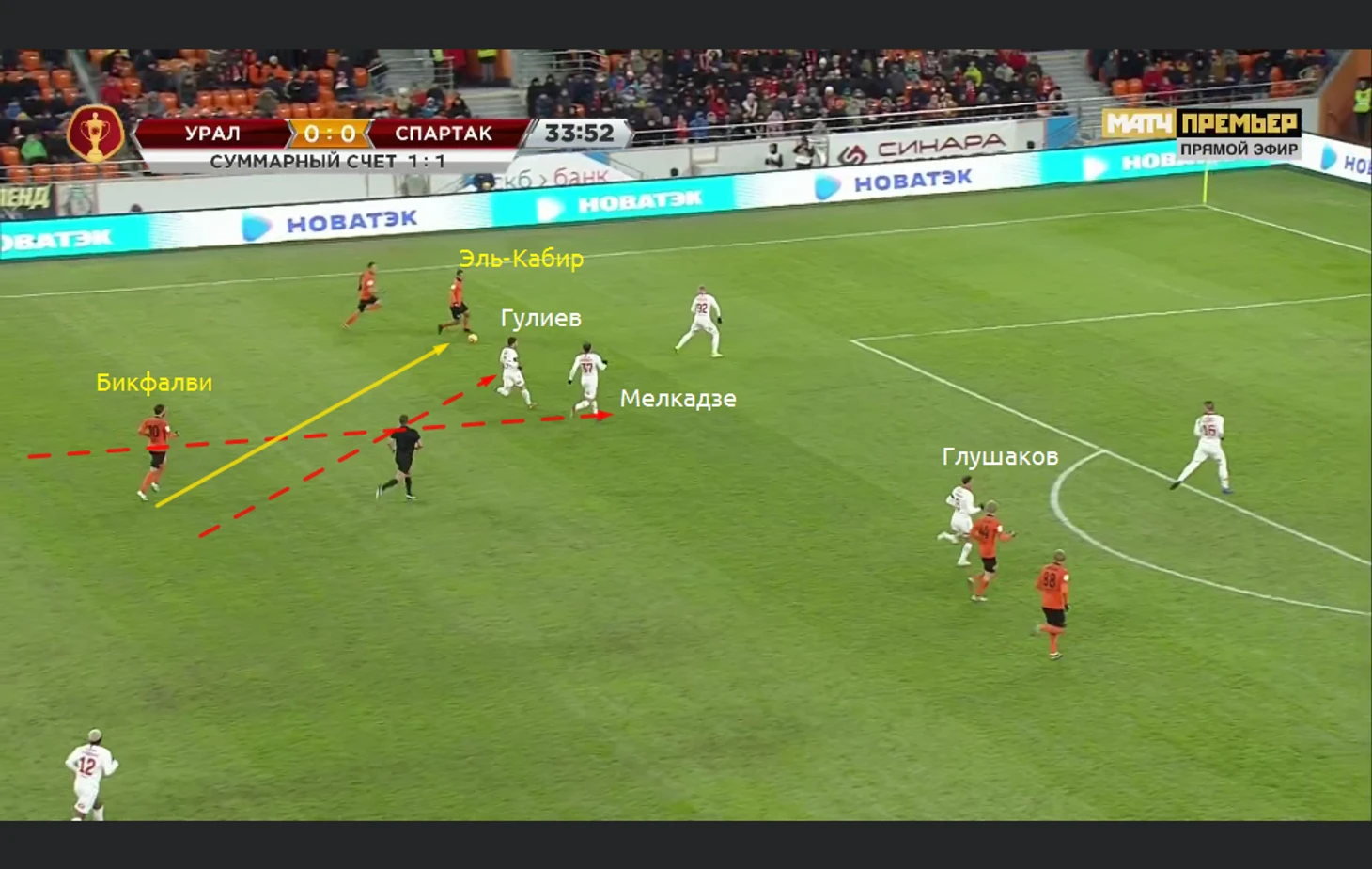 Гулиев дёрнулся атаковать Бикфалви на приёме мяча, но не вышло, в итоге передаче на Эль-Кабира он никак не помешал. А потом побежал на фланг игнорируя, что в эту зону уже двигается Мелкадзе. В итоге Бикфалви вновь оказывается без опеки и получает обратный пас от Эль-Кабира. Далее удар, рикошет и гол: