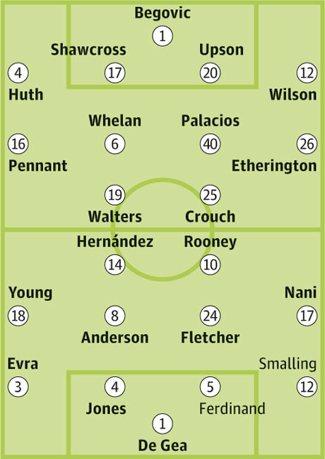 Запасные: Кущак, Линдегаард, Эванс, Оуэн, Бербатов, Кэррик, Уэлбек, Гиггз, Парк, Македа, Диуф, Валенсия, Фабио