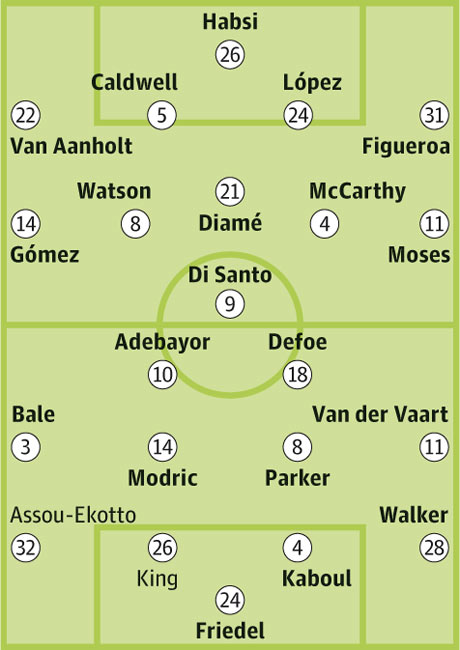 Запасные: Кудичини, Гомес, Хаддлстоун, Чорлука, Бассонг, Джованни, Ливермор, Сандро, Фальке, Таунсенд, Пинар