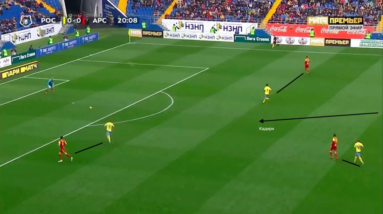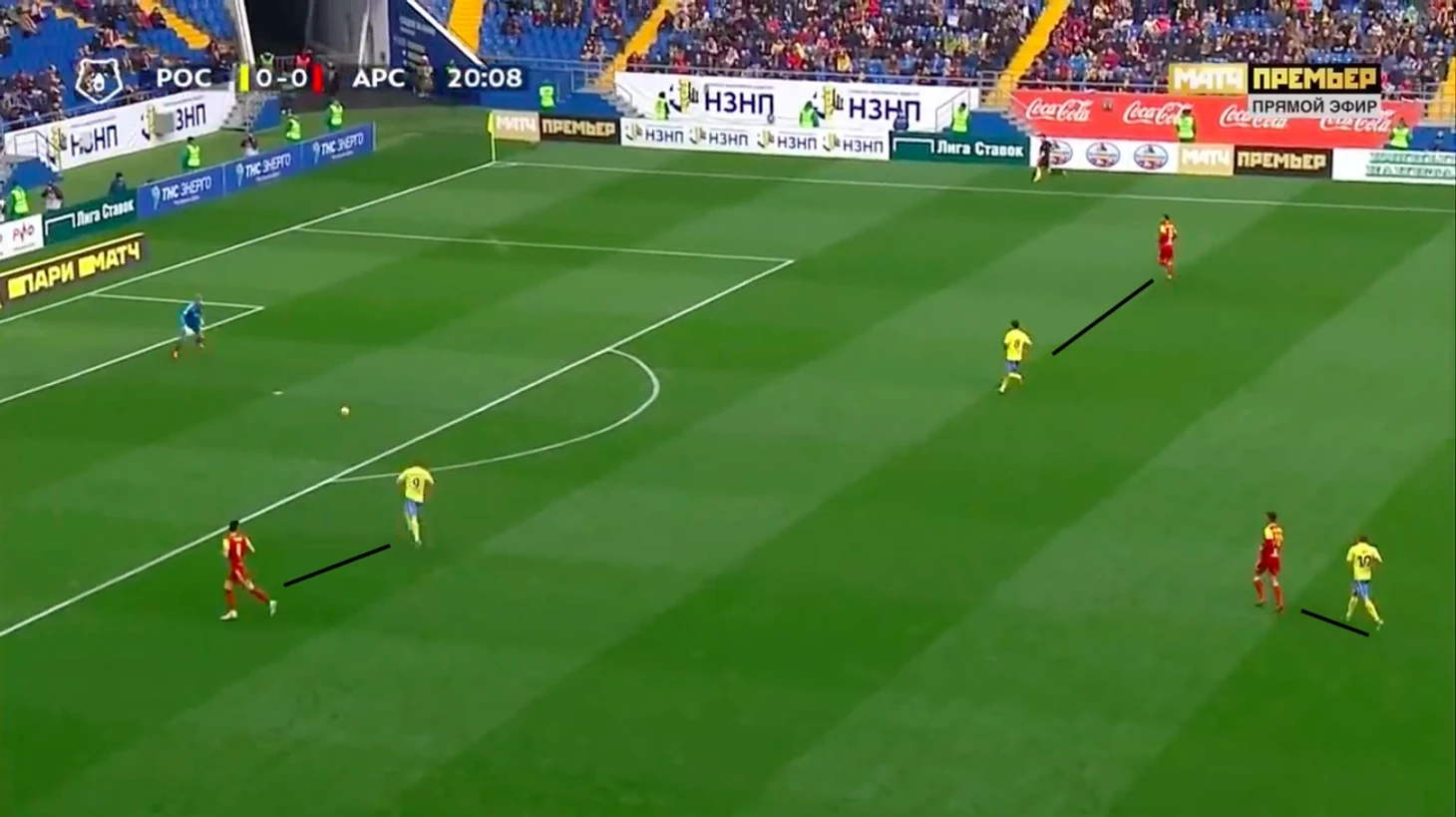 С первых минут был виден отличный прессинг Ростова. Этому сильно способствовала схема хозяев. Первую волну давления создавали Сигурдарсон и Попов, а против опорников играли персонально. Иногда они застревали и не доигрывали эпизод. Именно эти факторы привели к срезке в ворота Арсенала. Гол отменили, но это был очень тревожный звонок для туляков. Объясню как это получилось.
