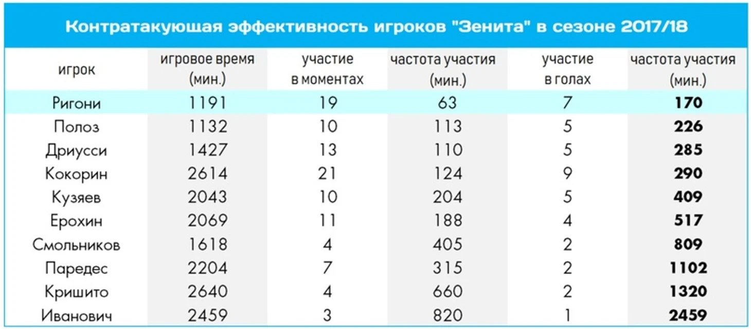 3 голевых момента в быстрых отрывах – локальный рекорд для «Зенита» в текущем сезоне (причем во всех турнирах). Этот всплеск однозначно связан с появлением Ригони, который в прошлом сезоне был самым эффективным контратакующим игроком в команде Манчини (7 из 18 голов в контратаках с личным участием).