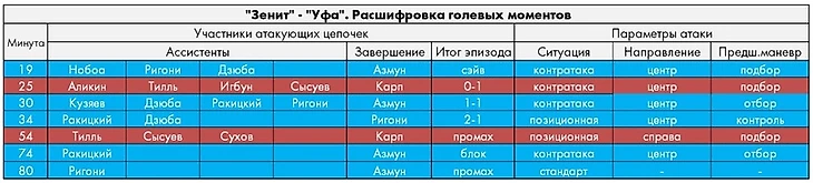 В итоге реальная острота после подач пару раз возникла лишь дважды при розыгрышах стандартов (Жирков на Дзюбу после подбора при угловом в середине первого тайма; Ригони на Азмуна с углового в концовке второго, когда на выходе ошибся Беленов) и в одной из контратак, когда защитники «Уфы» были вынуждены обороняться лицом к своим воротам и не разобрали в своей штрафной зенитовских форвардов.
