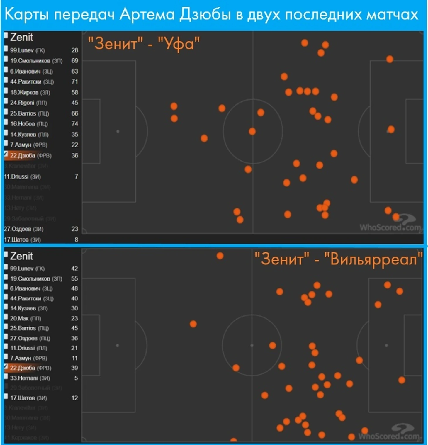 В какой-то мере проблемы хозяев в позиционном нападении были связаны с особой ролью Дзюбы, который вновь постоянно опускался к центральному кругу для помощи в розыгрыше (фактически, 4-4-2 в атаке у «Зенита» трансформировались в 4-5-1).