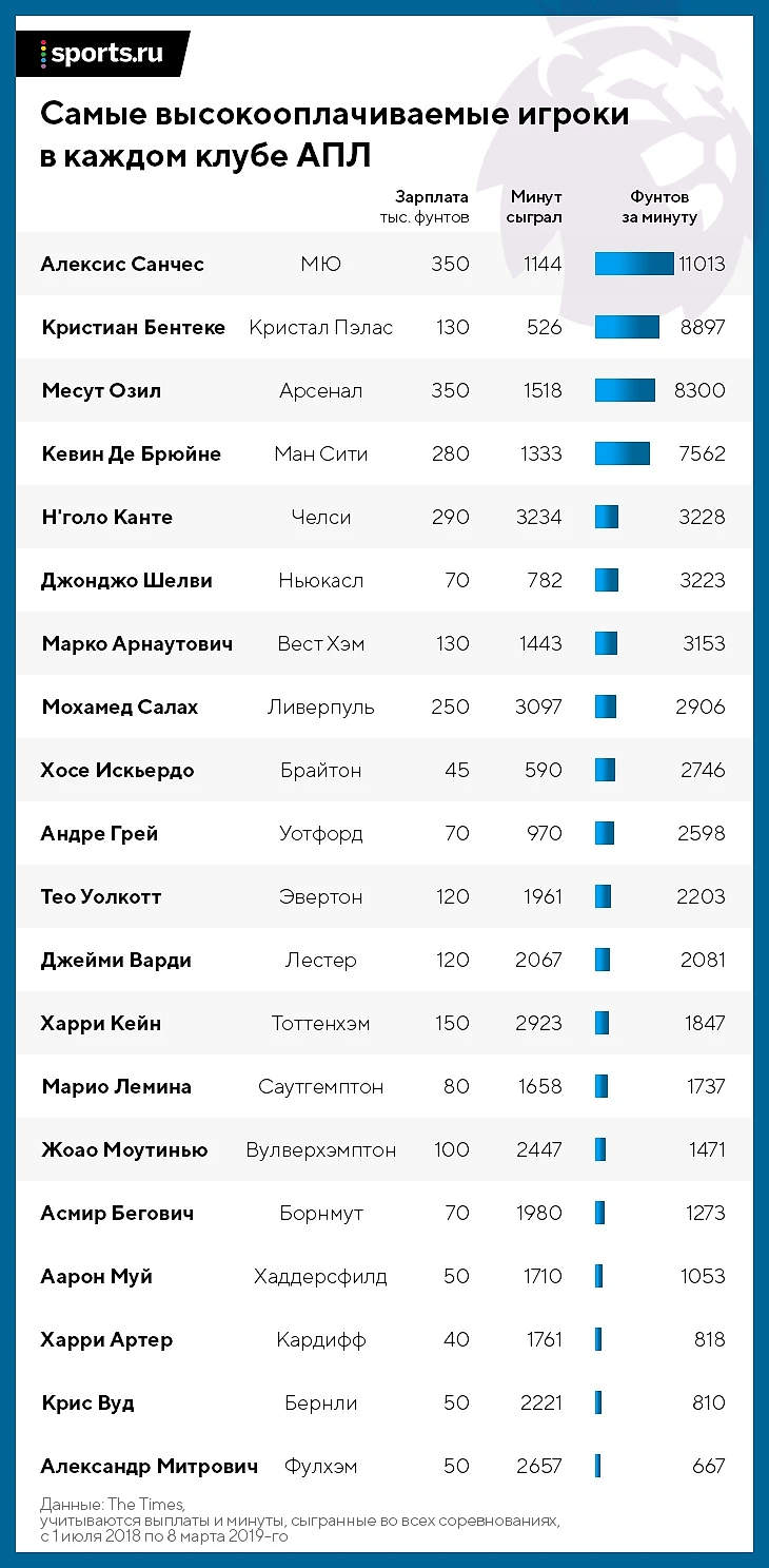 The Times опубликовала инфографику про самых высокооплачиваемых игроков АПЛ. В основе – минуты, сыгранные ими во всех турнирах после 1 июля 2018 года (и до 30-го тура АПЛ).