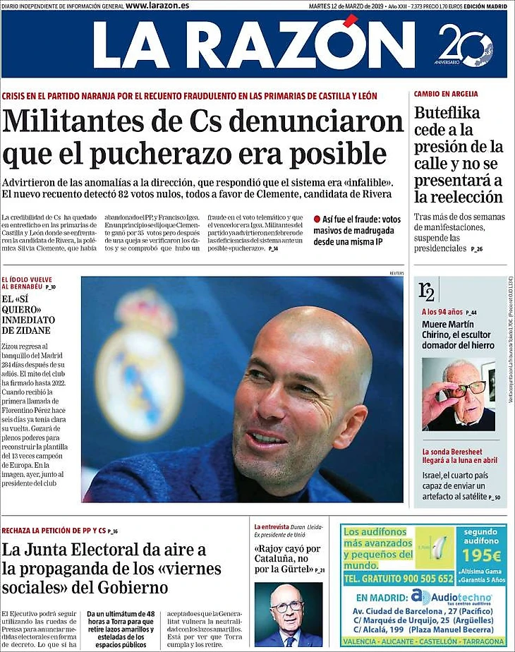 Алжирский политический кризис, брекзит, каталонские сепаратисты на выборах в Европарламент, Трамп – главным новостям в испанских СМИ сегодня утром пришлось потесниться. Зинедин Зидан царит не только в спортивной прессе, но и в изданиях широкого профиля.