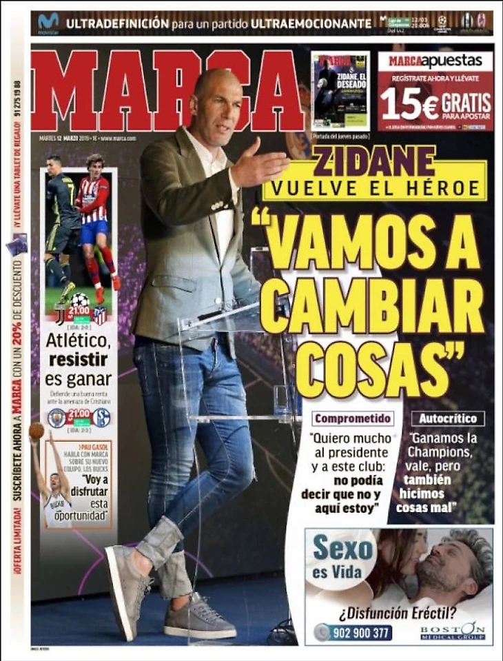 Мадридская "AS" добавила ещё больше торжественности. На фото – официальные лица, Зидан с женой и Перес, а ещё легенды «Реала» Пако Хенто, Эмилио Бутрагеньо, Роберто Карлос, Рауль. Пришёл даже Альваро Арбелоа. Над фото – подпись: «Он вернулся и получил все полномочия». Под фото – несколько самых важных высказываний нового тренера с презентации. «Я не мог сказать нет». «Хочу вернуть этот клуб на то место, где он должен находиться». «Четыре месяца назад я бы не принял это предложение». «Мы многое изменим. Время на это есть». «В прошлый раз у меня не всё получилось: Кубок, чемпионат…».