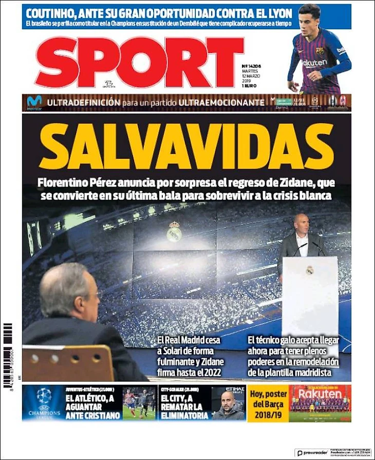 "Sport" (тоже из Каталонии) в заголовке называет француза спасателем. «Флорентино Перес объявляет о неожиданном возвращении Зидана. Это его последняя надежда на преодоление кризиса».