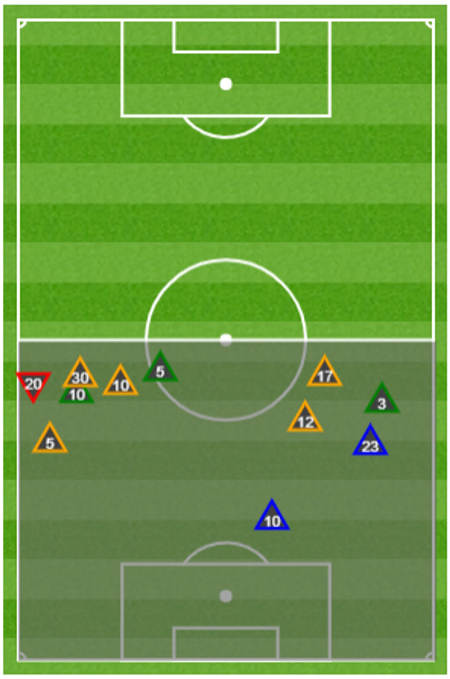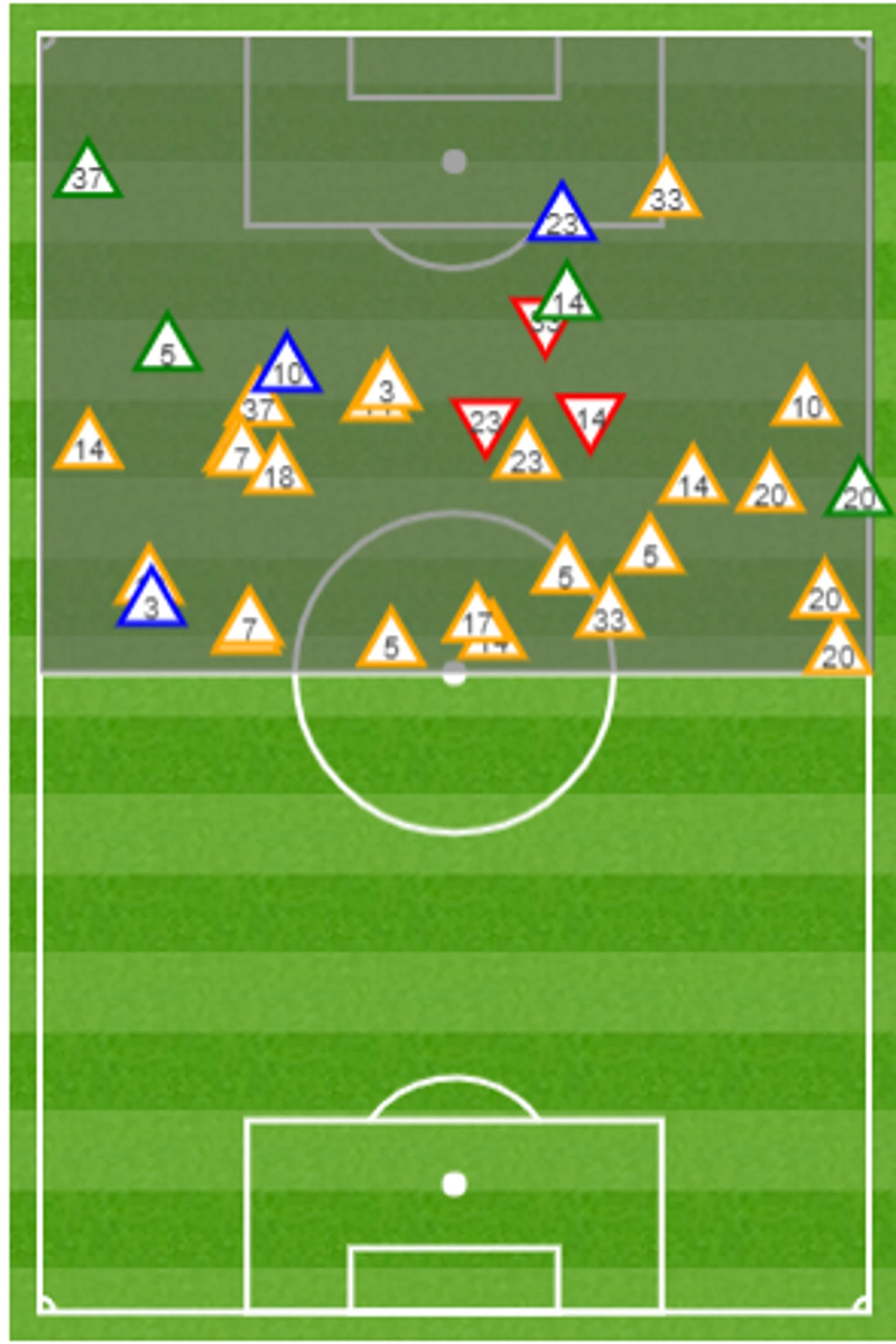 Желтые треугольники на карте – это подборы. Чаще всего мгновенное давление «Юве» приводило именно к ним. Важность этого элемента для доминирования «Ювентуса» подчеркивал Симеоне: «Тактически соперник нас превзошел. Они были лучше на подборах, поэтому так уверенно выиграли матч».