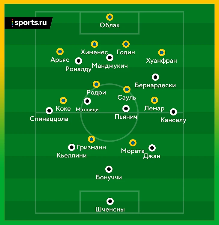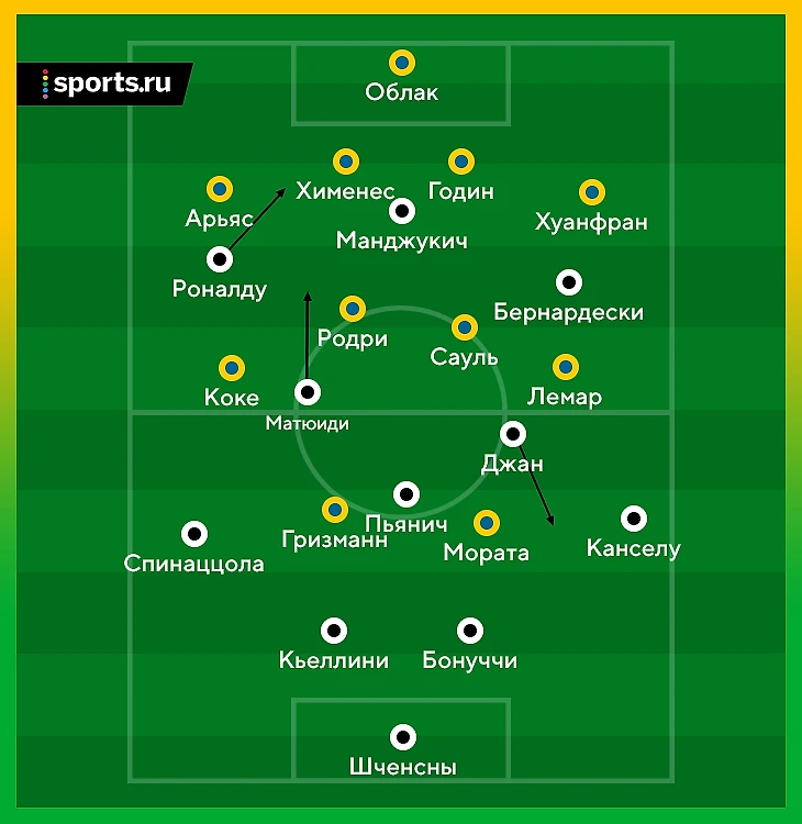 План Аллегри с фланговой игрой и навесами по понятным причинам оказался максимально удобным для Криштиану. Он получил моменты. «Роналду – великий. В первом матче мы оборонялись хорошо и вообще не дали ему моментов. Сегодня у него было три – он забил три», – подытожил Гризманн.