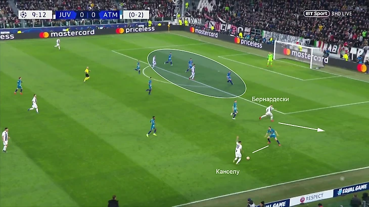 Второй – на латераля «Юве» (Канселу) выдвигается фланговый защитник «Атлетико» (Хуанфран). В таком сценарии в штрафной становится в разы менее плотно (2-в-3 в пользу «Атлетико» в случае подачи – хорошее соотношение для атакующей стороны), а на фланге Бернардески с Канселу получают преимущество: