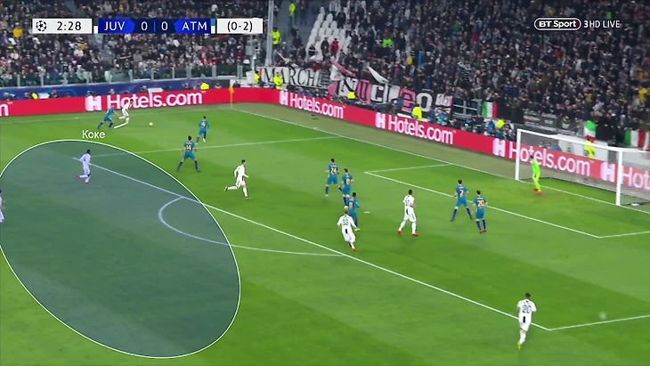 Первый – фланговый полузащитник «Атлетико» (Коке) до конца играет с латералем «Юве» (Спинаццолой) по флангу. Это оставляет центр поля слишком открытым: