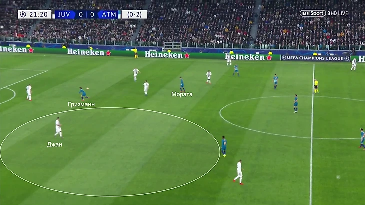 Вот попытка. Обычно при прессинге «Атлетико» один нападающий начинает давление (Гризманн), а другой следит за опорником соперника и готовится выдвигаться на другого защитника (Мората). Но у «Юве» все равно остается свободный игрок (Джан) – в этом эпизоде до него легко довели мяч в три паса. Прессинг легко разбили: