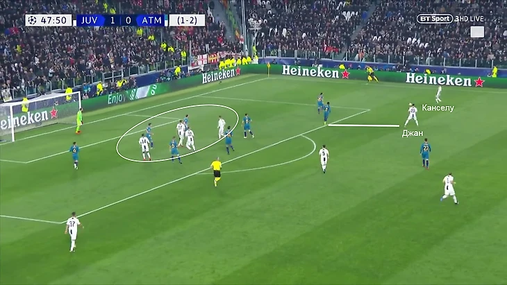 Второй гол Роналду – шикарный пример. Во второй половине «Юве» действовал еще смелее – Джан поддержал атаку с позиции центрального защитника, чем отвлек Лемара. У Канселу свобода перед навесом. В штрафной преимущество «Атлетико», но именно около центральных защитников (зона подачи) находятся 4 футболиста: