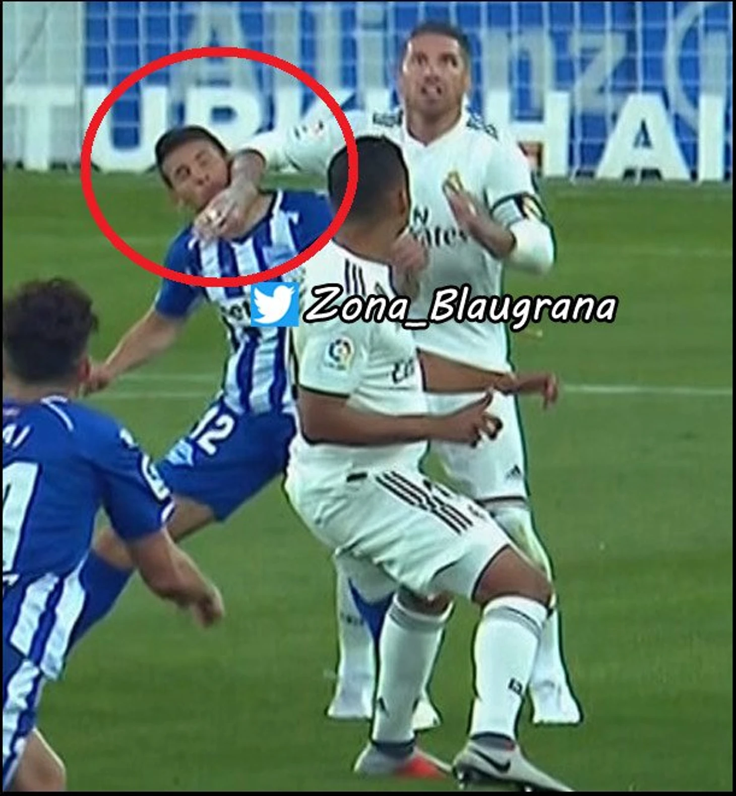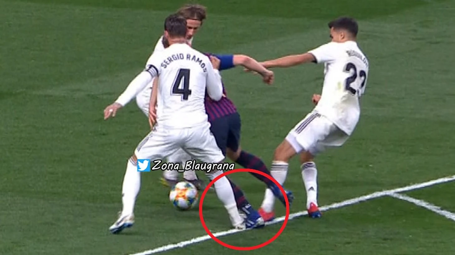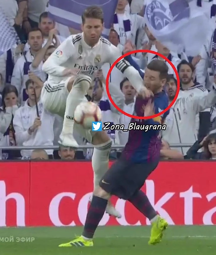 Еще несколько примеров абсолютной безнаказанности Рамоса. В 1-м матче на Камп Ноу он сыграл рукой в своей штрафной - естественно, свисток промолчал.