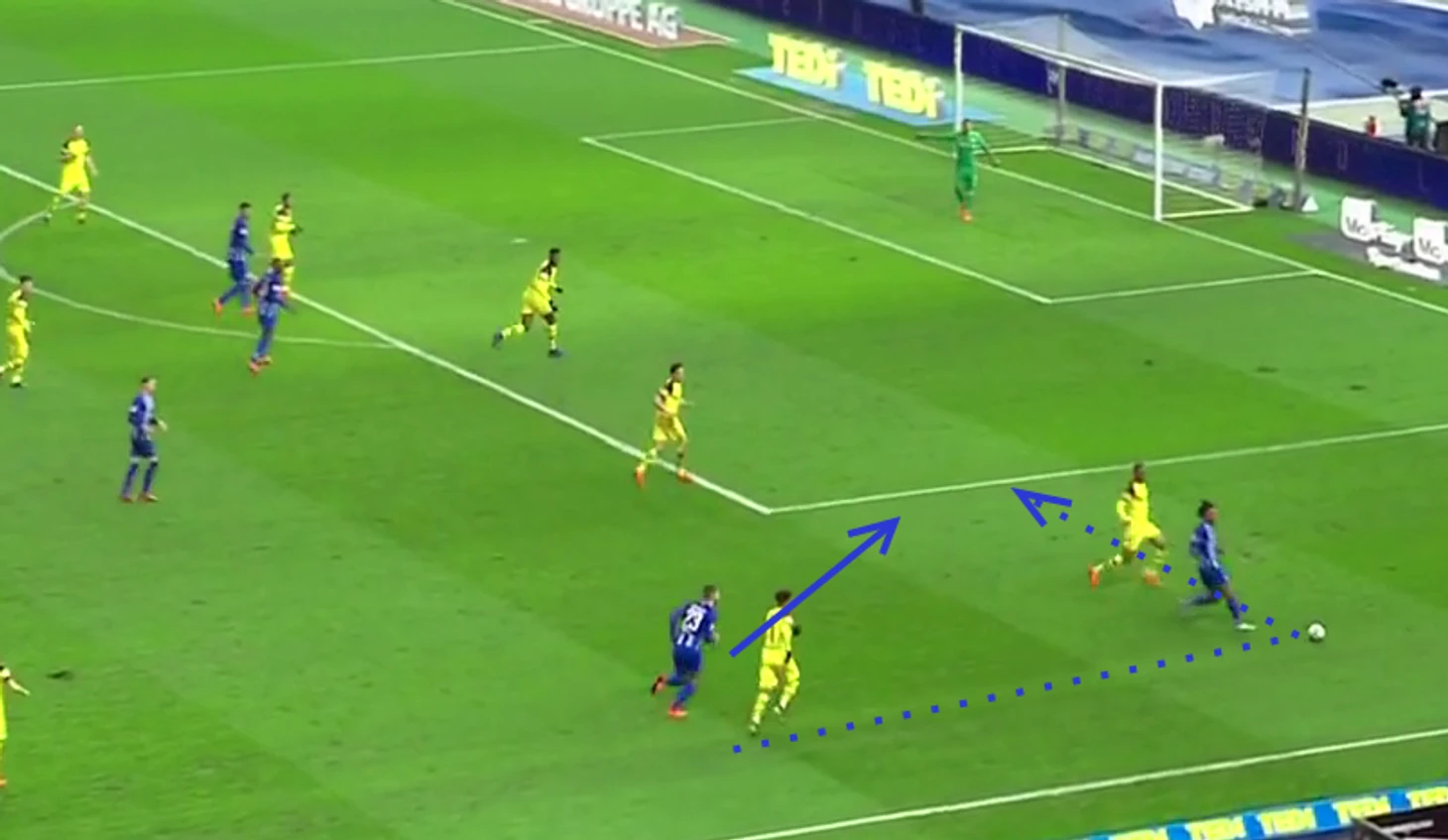 На примере выше, можно увидеть, как при розыгрыше от ворот берлинцы оставляют лишь одного свободного адресата - Загаду, чтобы атаковать его после получения. Гости в таких ситуациях чаще всего предпочитали не играть с огнём и просто били вперёд, что заканчивалось потерями.