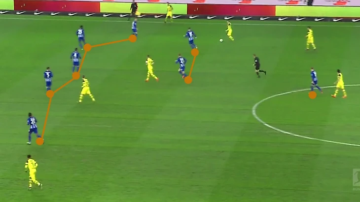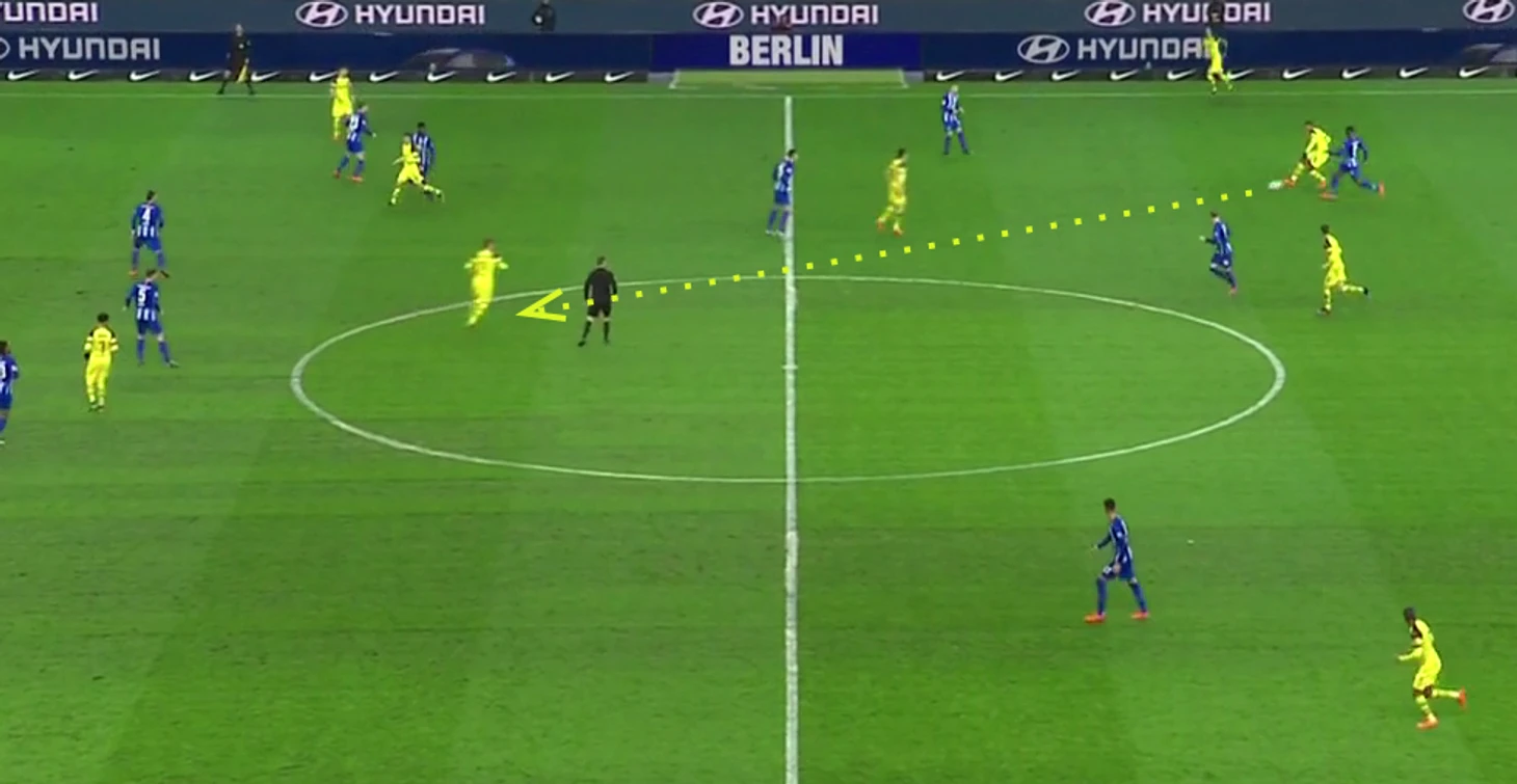 Таким образом использовалась особенность прессинга Герты, состоящая в том, что Груйич и Майер чаще атакуют защитников и смещаются на фланги, оголяя опорную зону, в то время как Лазаро и Миттельштедт располагаются глубже.