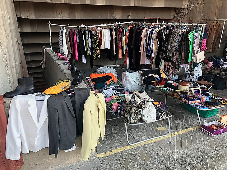 Каждая торговая точка напоминает чей-то шкаф, вещи из которого переехали к трибунам «Раздана» и расположились на раскладушках. Пиджаки, блузки, штаны, бутсы, сумки – все переплетено.