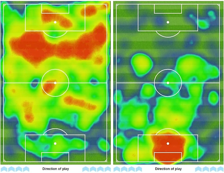 Тепловая карта матча: слева – атакующий «Насьональ», справа – обороняющаяся «Сулия»