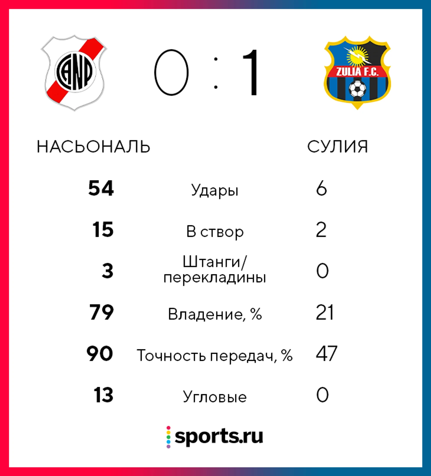 Статистика поражает: «Насьональ» нанес 54 удара (по 27 в каждом тайме), но умудрился не забить. Два игрока – Владимир Кастельон и Бруно Паскуа – пробили по 10 раз.