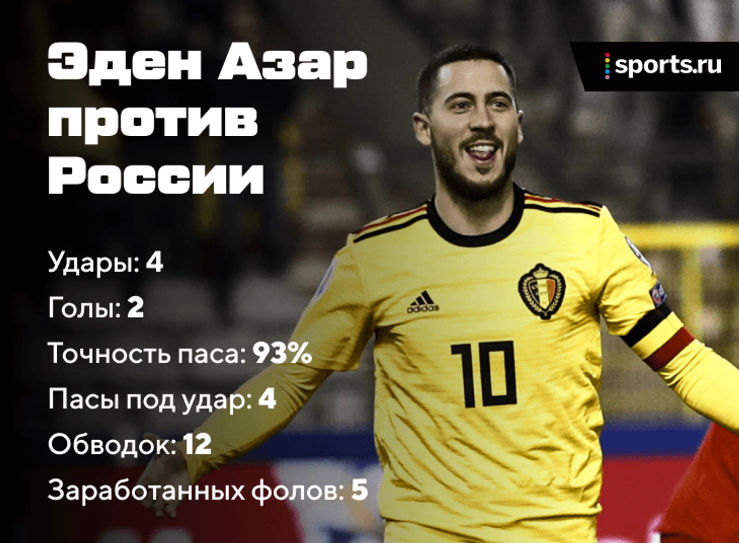 • По точности передач Азар четвертый игрок матча (в первой тройке нет никого из сборной России), впереди Азара только пара центральных защитников (Боята и Вертонген) и оборонительный полузащитник Дендонкер.