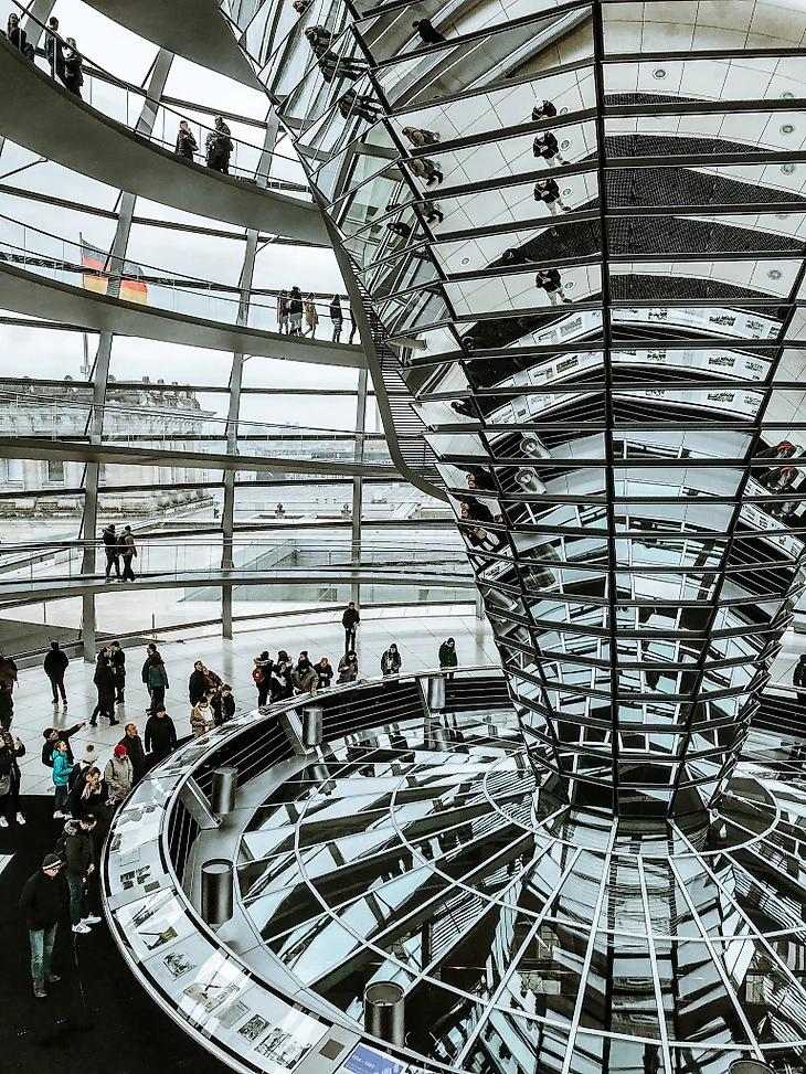 Экскурсия - это подъем на вершину здания к стеклянному куполу. Он был спроектирован архитекторами уже в 90х годах и должен олицетворять новую Германию. Сделан он в форме спирали и символизирует превосходство народа над властью, а не вот это вот всё.