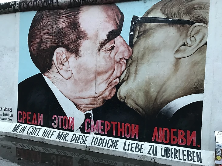 Это граффити уже стало визитной карточкой Берлина и его лепят куда только можно - магниты, открытки и все прочие виды сувениров. Всегда находятся вандалы, которые добавляют элементы своего творчества, поэтому власти периодически обновляют оригинал.