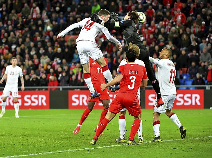 84-я минута. В штрафной Швейцарии неловкий момент: дальний заброс Эриксена со штрафного выглядит неудачным, мяч отскакивает от газона, защитники замирают, а Матиас Йоргенсен из «Хаддерсфилда» набегает к штанге и замыкает головой.