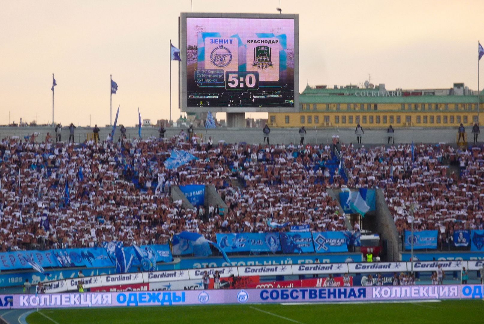 Аншлаг действительно состоялся. На 2-ой минуте матча весь стадион встает и начинает петь гимн «Зенита». Текст на всякий случай показывают на многофункциональных табло стадиона. Это правильно, ведь на арену часто попадают туристы. Если конечно, им везет с билетиком...