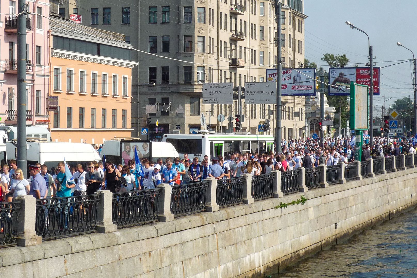 Складывается такое чувство, что стадион «Зенита» «Петровский» вмещает не 22 тысячи зрителей, а все 80. Весь город направляется к стадиону, на выходе из метро заторы, перекрываются многочисленные улицы. Одна из них – самая главная на подступах к стадиону, который кстати расположен на острове Петровский, Ждановская набережная.