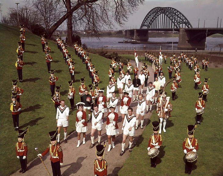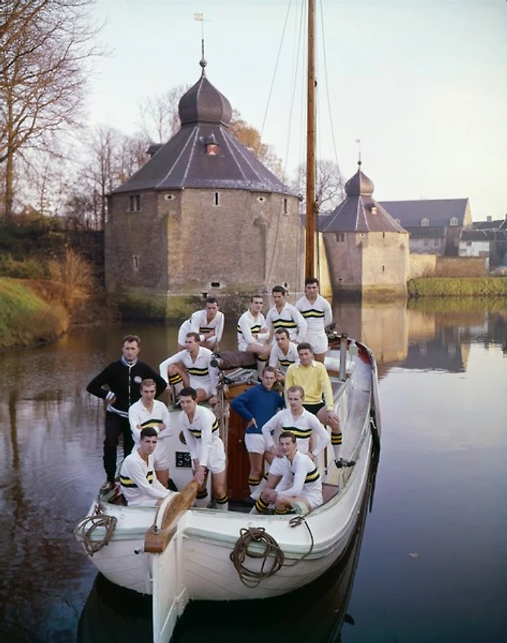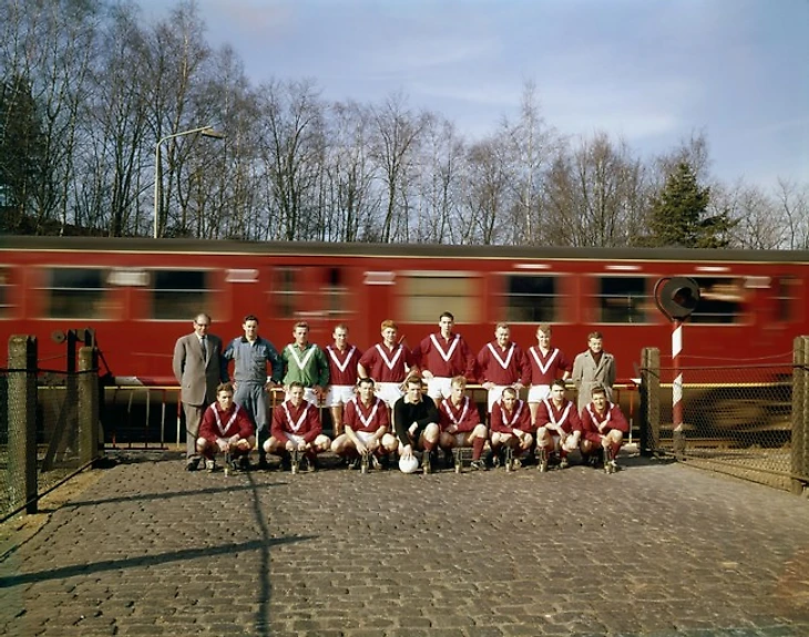 Футболисты и тренерский штаб футбольного клуба "Рапид Юлиана" из города Керкраде на фоне проходящего поезда. В 1962 году "Рапид Юлиана", чемпион Нидерландов сезона-1955/56, объединился с командой "Рода Спорт" - так появился на свет футбольный клуб "Рода" (Керкраде).