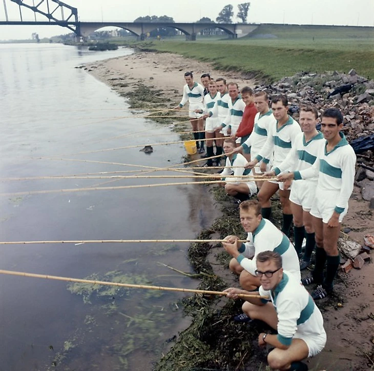Футболисты "Зволле" удят рыбу в реке Эйссел. Надеяться на улов в такой мутной воде не приходится, но есть мнение, что только золотая рыбка могла помочь "Зволле" разгромить "Аякс" со счетом 5:1 в финале Кубка Голландии в 2014 году.
