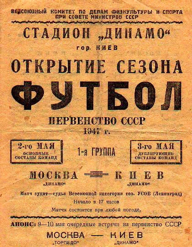 Вот, например, афиша матча между киевским и московским «Динамо» в 1947 году. Фраза «Матч состоится при любой погоде» – в нижней части.