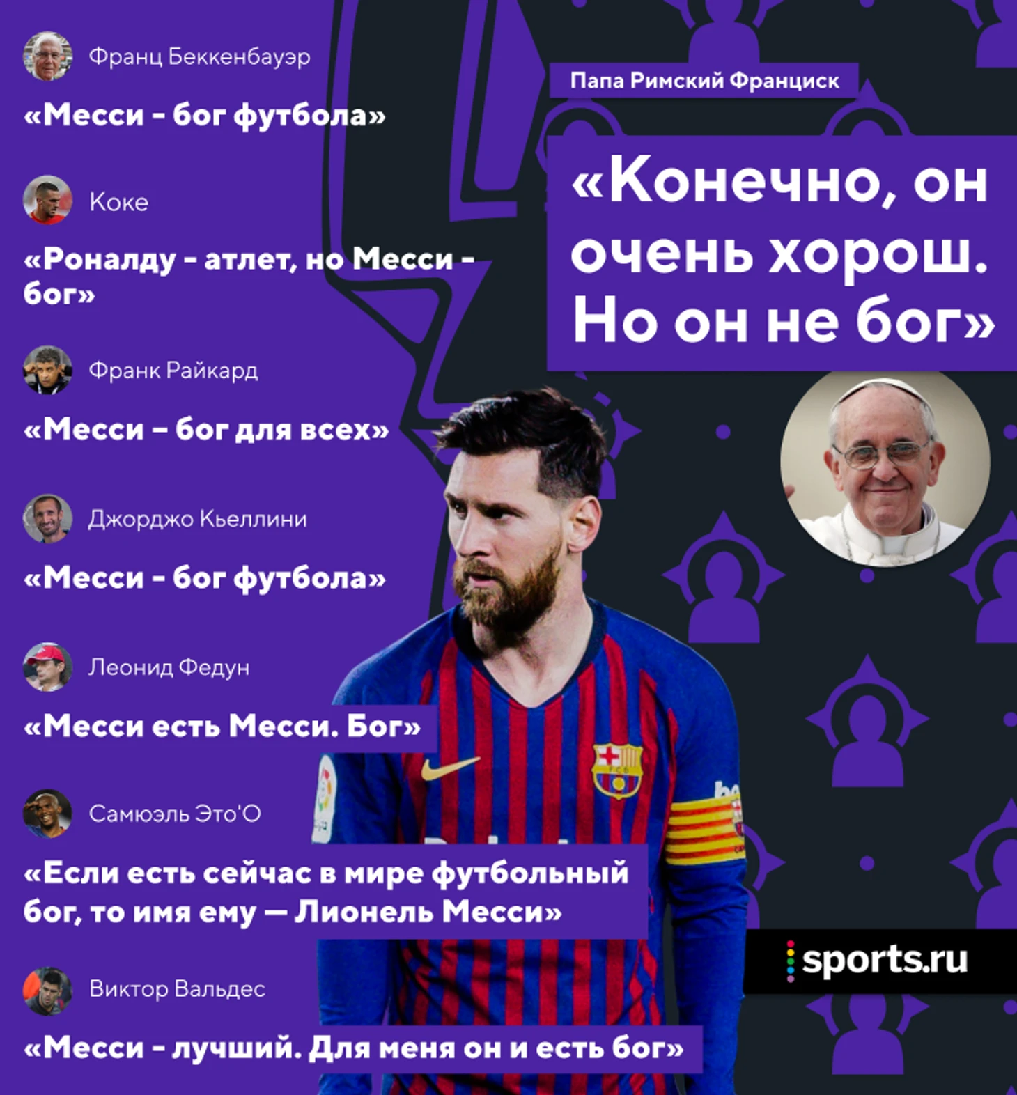 Папа не одинок в своем мнении – например, Пеле говорил, что Месси недостаточно разносторонний игрок и что Марадона был намного лучше него. Кто-то (например, тренер «Барселоны» Вальверде и футболист «Барселоны» Малком) считает, что Месси не бог, но инопланетянин.