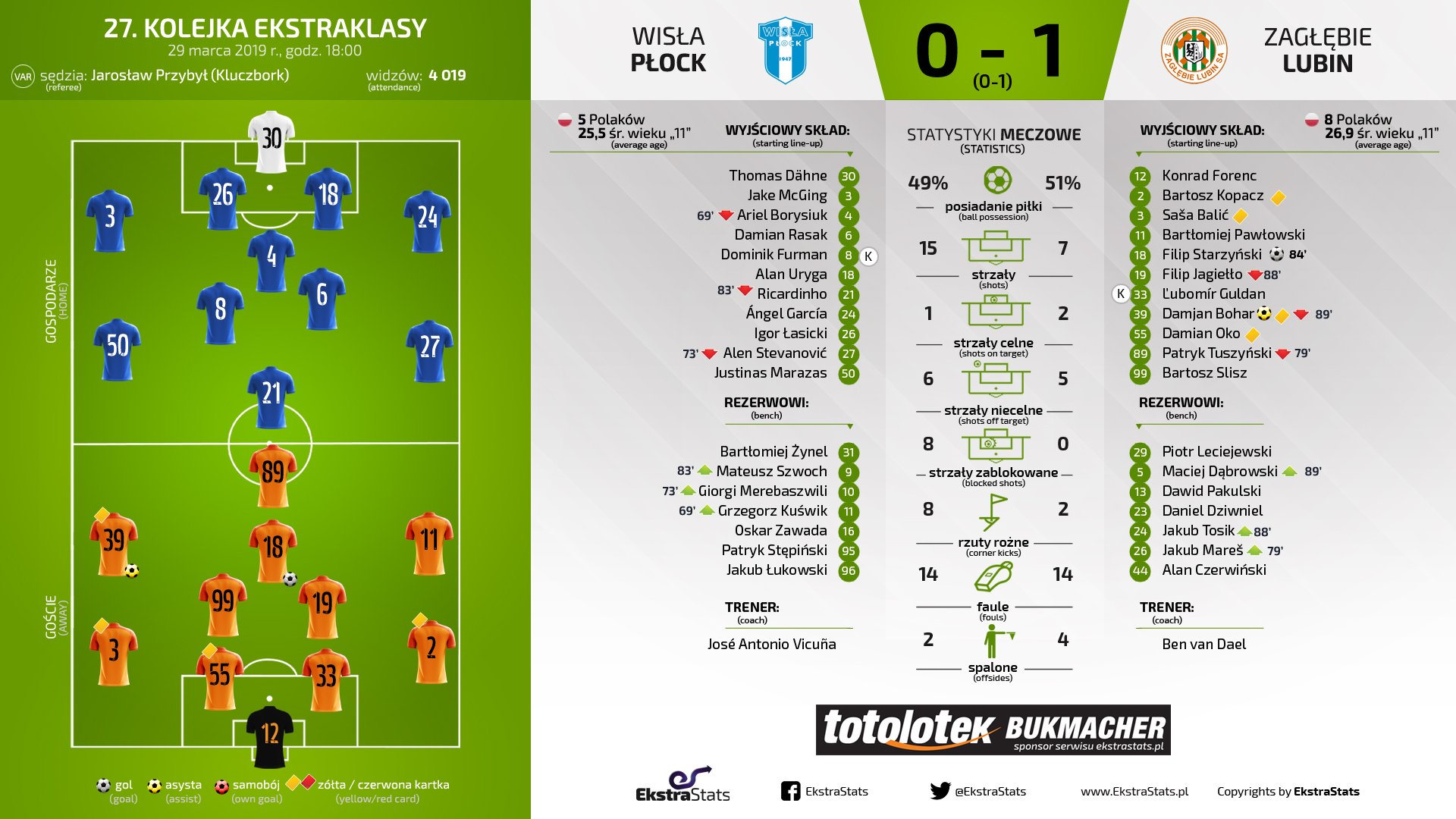 27-ой тур открывался матчем в Плоцке, где встретились команды, решающие разные задачи. Любинцы продолжают бороться за верхнюю восьмерку, борьба в которой за еврокубковые места обещает быть горячей, плоччане же никак не могут выбраться из зоны вылета и матч против «Заглембе» был очередным шансом взобраться на спасительную 14-ую строчку. Первый тайм прошел практически без моментов, команды ни разу не ударили в створ ворот друг друга, уйдя на перерыв с нулями на табло. Вторая половина матча прошла уже куда интереснее. Первый опасный удар нанес молодой литовец Маразас, который пробил с дальней дистанции после не лучшей подачи с угла поля от Фурмана, но полузащитника хозяев подвела точность. Через пять минут Флоренцу уже пришлось вступать в игру. Рикардиньо вошел в штрафную и пробил в дальний угол, однако голкипер гостей без особых трудностей парировал удар форварда «нефтяников». Любинцы ответили своими атаками левым флангом, на котором играл Дамьян Бохар. И если первый проход по флангу закончился подачей в штрафную на Павлвоского, пробившего мимо ворот, то второй подход был уже куда опаснее. Дэнэ ошибся на выходе, что привело к тому, что Тушиньски то ли подавал в штрафную то ли пробивал по пустым ворота. Гости простили немецкого кипера за ошибку, Тушиньски не попал по воротам. Последняя десятиминутка вышла куда опаснее, чем предыдущие восемьдесят минут. Сначала Меребашвили прошел по левому флангу и прострелил вдоль ворот, а Маразас в падении не попал по пустым воротам с нескольких метров. А через несколько минут вторую ошибку совершил Дэнэ. На этот раз, «оранжевые» не простили плоччан, в роли исполнителя наказания выступил Филип Стажиньски. «Нефтяники» побежали отыгрываться, но нарвались на две опаснейшие контратаки. Первая из них завершилась падением Бохара в штрафной хозяев, но это падение словенца арбитр оставил без внимания, а через минуту Якуб Марес вышел один на один с Дэнэ, но пробил рядом со штангой. «Заглембе» побеждает и поднимается в верхнюю половину таблицы, плоччане же в семи матчах после возобновления чемпионата набрали всего четыре очка, что никак не позволяет выбраться из зоны вылета.