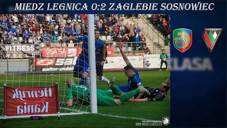В Легнице в отчетном туре встречались команды, которые еще год назад выступали во втором по силе дивизионе Польши. После 26 туров легничане расположились на 13-ой строчке, а сосновчане замыкали турнирную таблицу. Как и подобает фавориту лучше матч начали хозяева, но ни Сантана, ни Роман не сумели огорчить Хрошшо. Забить быстрый мяч у хозяев не получилось. За это они вскоре поплатились пропущенным мячом. Подача с левого фланга нашла одинокого Габедаву, который забил свой первый мяч в футболке «Заглембе». В первом тайме «медзянка» имела несколько возможностей, чтобы сравнять счет. Свою ошибку пытался исправит Камара, но точно пробить ему помешали защитники гостей, а удар Романа пришелся выше ворот. На перерыв «Медзь» ушла, минимально уступая в счете. Второй тайм начался с опаснейшего момента у ворот гостей. Спустя десять секунд после начала второй 45 минутки Пясецки принял мяч, который на него был заброшен из глубины, пробросил его себе на ход и нанес удар, однако Хрошшо успел выйти и сократить угол обстрела. В данном эпизоде словацкий кипер получил небольшое повреждение. А вскоре хозяева поплатились за свою расточительность. Быстрая атака закончилась скидкой Габедавы на Павловски, который вошел в штрафную и заработал на себе фол. К точке подошел не сам пострадавший, а Матеуш Можджень. Каниболоцкий сумел отбить одиннадцатиметровый удар, однако на добивании первым оказался сам бьющий. Отставание в два мяча вынуждало легничан раскрываться, чтобы спасти матч против своего прямого конкурента в борьбе за выживание. Форссел был не так опасен в этом матче, ему не позволяли наносить дальних ударов, да и защитники сосновчан старались не фолить вблизи своей штрафной площади. Единственный опасный удар финн нанес из пределов штрафной рядом со штангой. По истечении часа игры до минимума отставание мог сократить Аугустыняк, который мощно пробил с лету под перекладину ворот гостей - Хрошшо перевел мяч на угловой. Спустя еще пять минут Аугустыняк добился своего, однако арбитр после просмотра VARа отменил взятие ворот. До конца матча легничане не сумели забить даже гола престижа, а «Заглембе» одержало первую победу на выезде в нынешнем чемпионате.