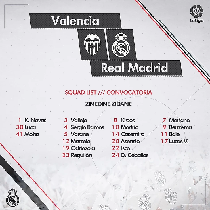 Заявка на матч с «Валенсией» в рамках 30 тура чемпионата Испании выглядит гораздо привычнее, чем в игре с «Уэской». В нее вернулись Варан, Кроос и Асенсио, а вот Браим Диас, Феде Вальверде, Начо и Маркос Льоренте на поле точно не выйдут.