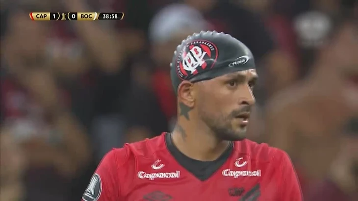 В моменте с первым голом ветерану разбили голову, поэтому он играл в модной шапочке для плавания.
