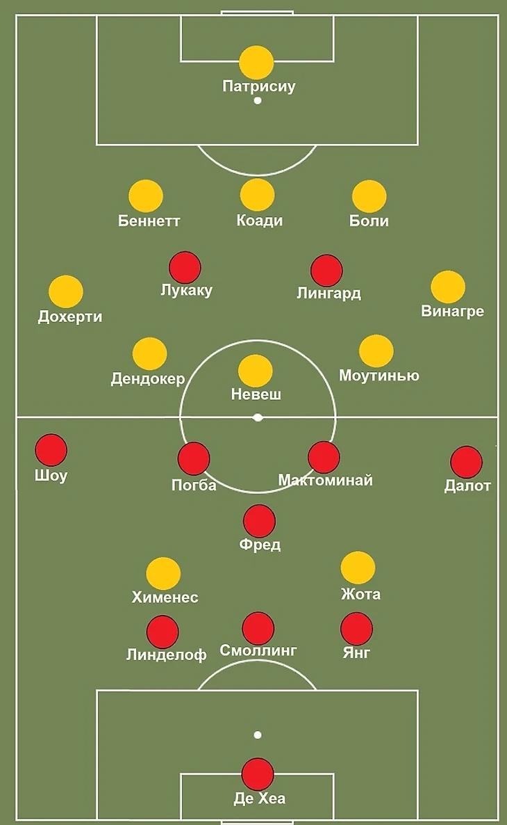 После этой перестановки Юнайтед стал чуть надёжнее слева(где активно поддерживал атаку Шоу) и смог использовать правый полуфанг Волков для момента Лукаку. Два отрезка доминирования команд сделали результат тайма максимально закономерным.